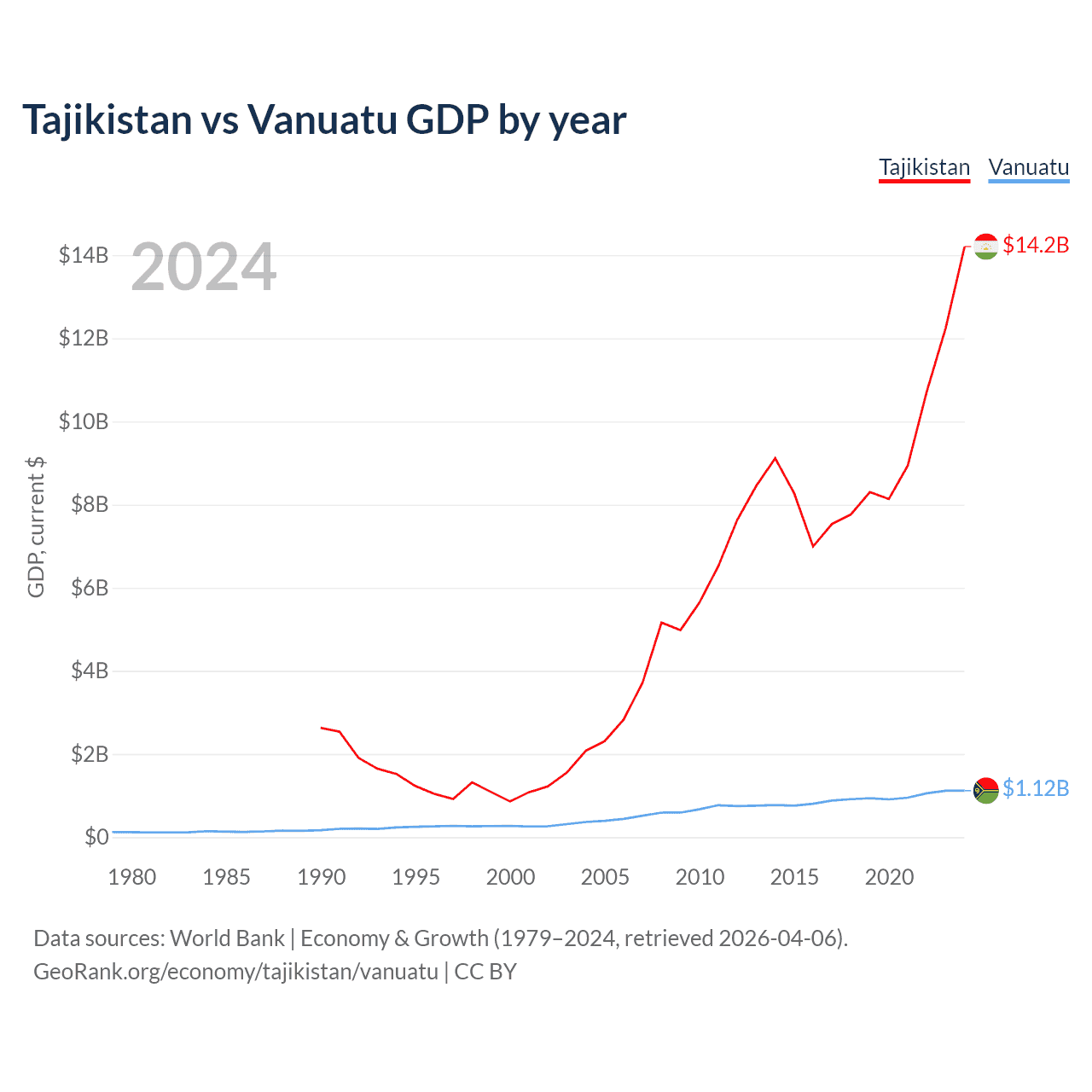 Tajikistan has a GDP of $14.2B compared to $1.12B for Vanuatu, ranking 145/197 and 188/197 by economy size, respectively.