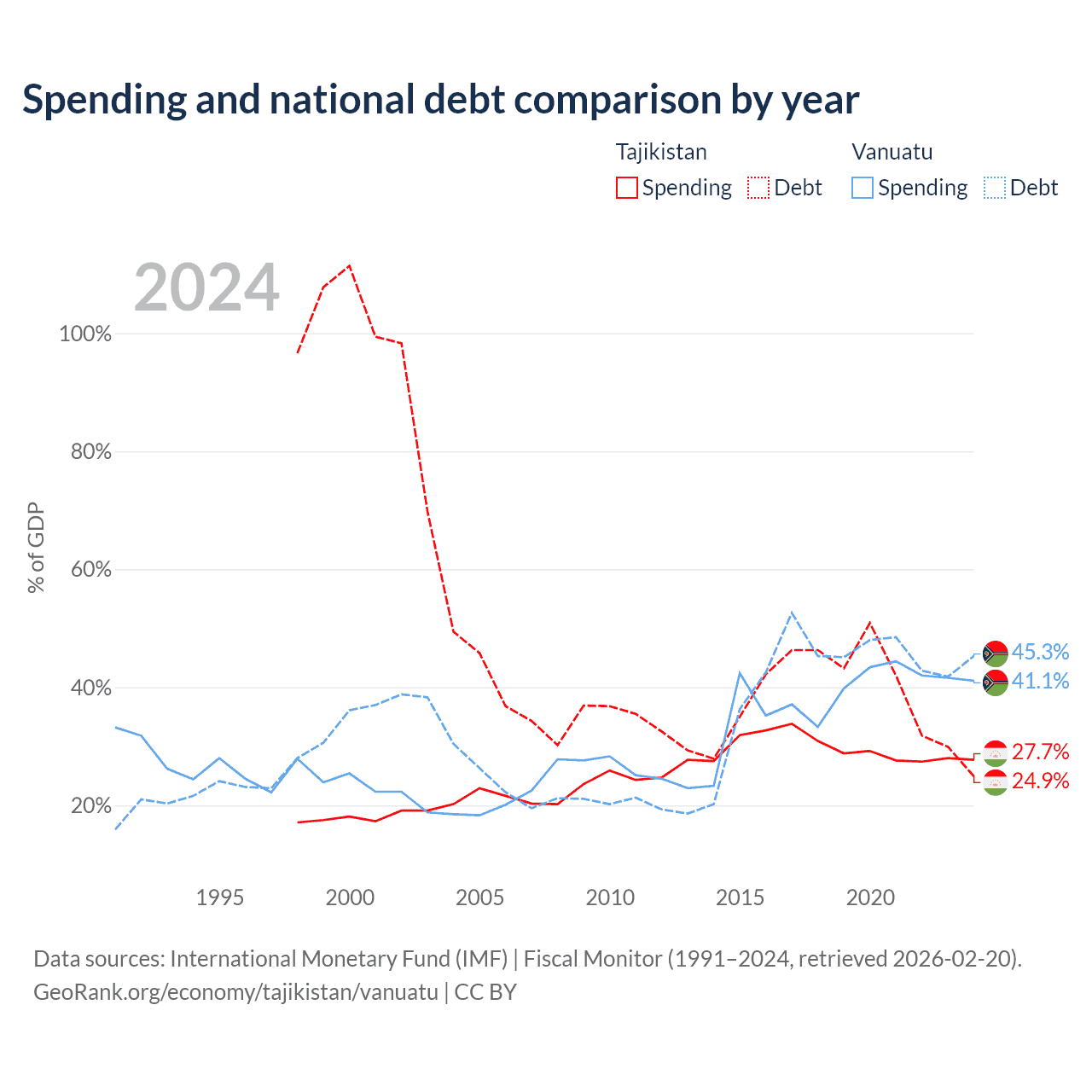 Tajikistan has $3.54B in government debt (24.9% of GDP), compared to $507M (45.3% of GDP) in Vanuatu.