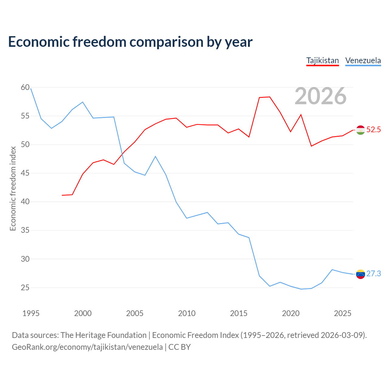 The Economic Freedom Index for Tajikistan is 52.5, ranking 147/197, compared to 27.3 for Venezuela, ranking 194/197. The chart above displays a comparison of annual changes in economic freedom indexes.
