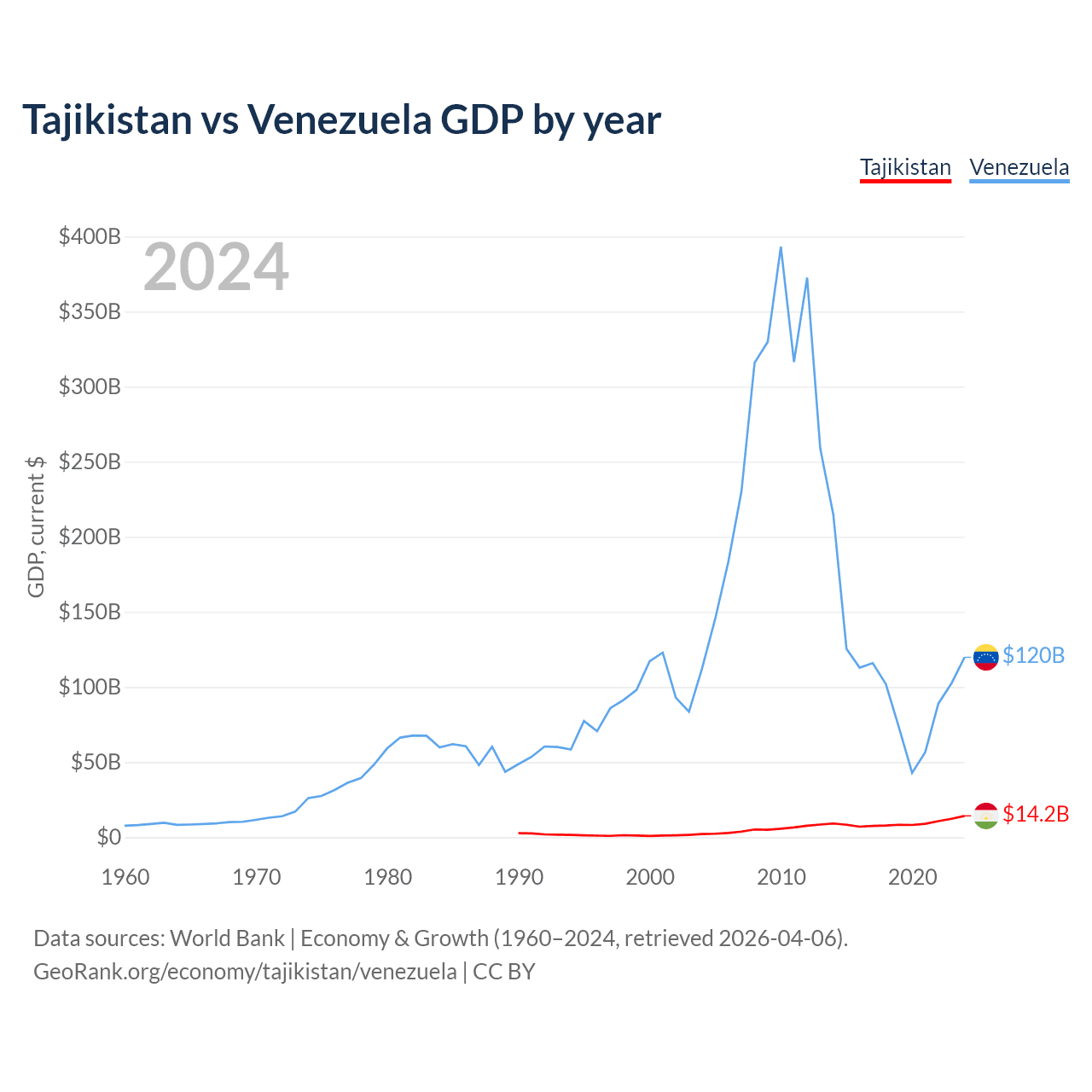 Tajikistan has a GDP of $14.2B compared to $120B for Venezuela, ranking 145/197 and 65/197 by economy size, respectively.