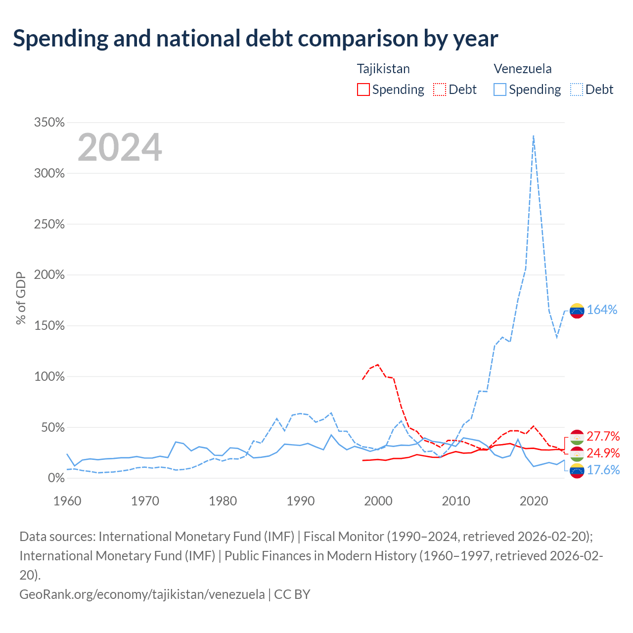 Tajikistan has $3.54B in government debt (24.9% of GDP), compared to $197B (164.3% of GDP) in Venezuela.