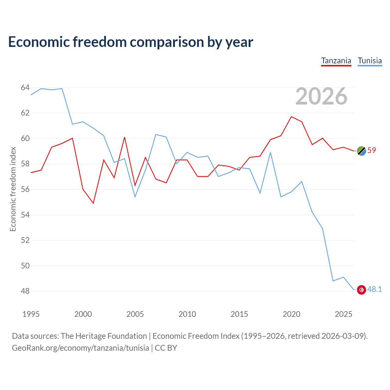 The Economic Freedom Index for Tanzania is 59, ranking 106/197, compared to 48.1 for Tunisia, ranking 172/197. The chart above displays a comparison of annual changes in economic freedom indexes.