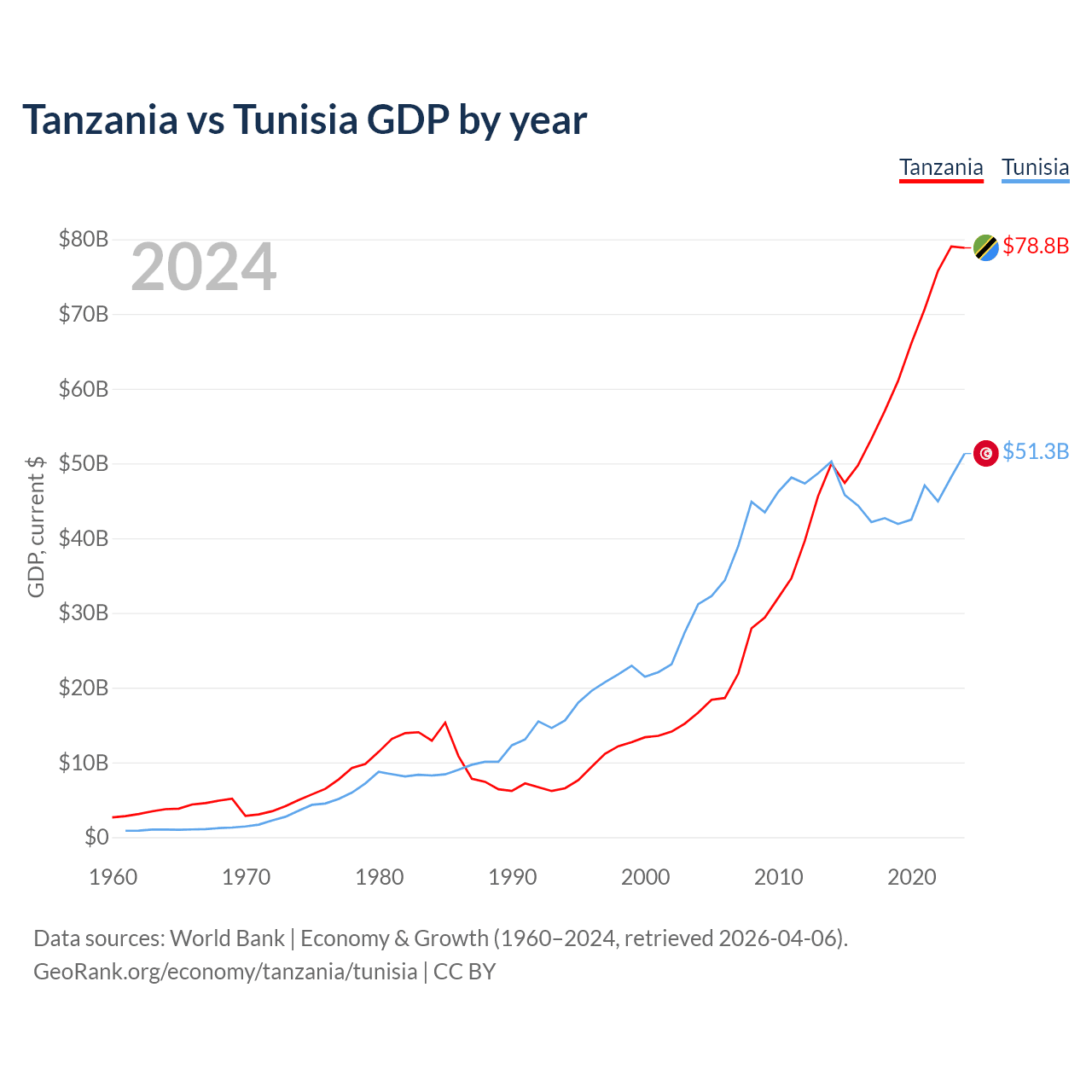 Tanzania has a GDP of $78.8B compared to $51.3B for Tunisia, ranking 82/197 and 93/197 by economy size, respectively.