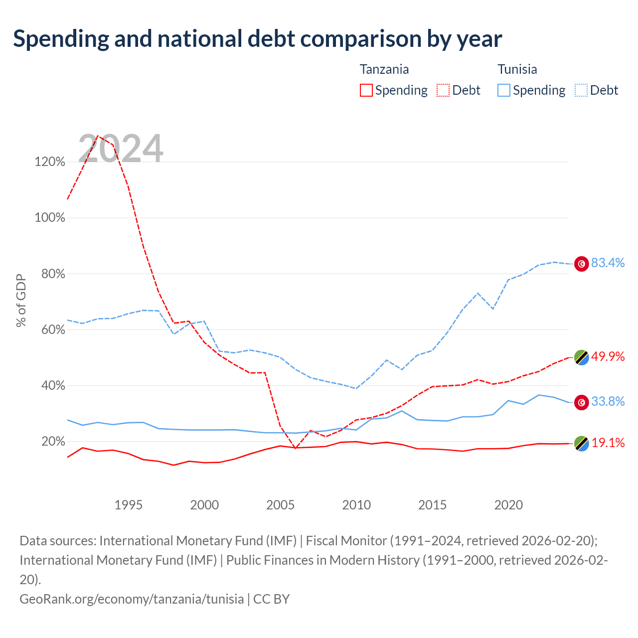 Tanzania has $39.3B in government debt (49.9% of GDP), compared to $42.8B (83.4% of GDP) in Tunisia.
