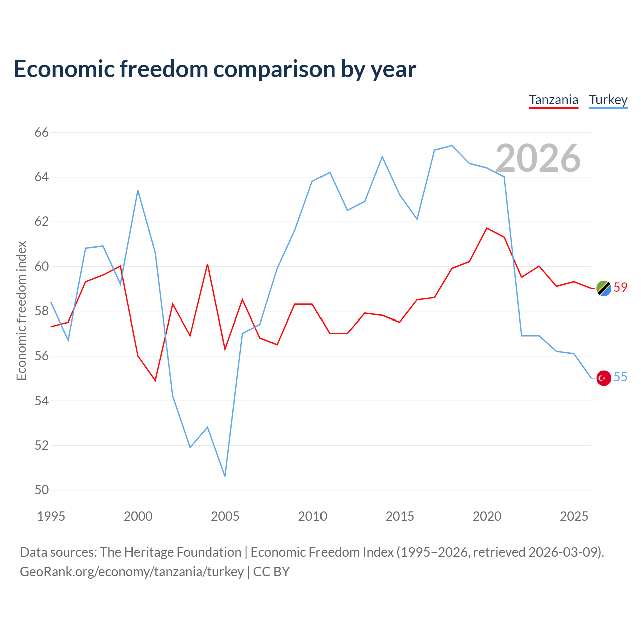 The Economic Freedom Index for Tanzania is 59, ranking 106/197, compared to 55 for Turkey, ranking 129/197. The chart above displays a comparison of annual changes in economic freedom indexes.