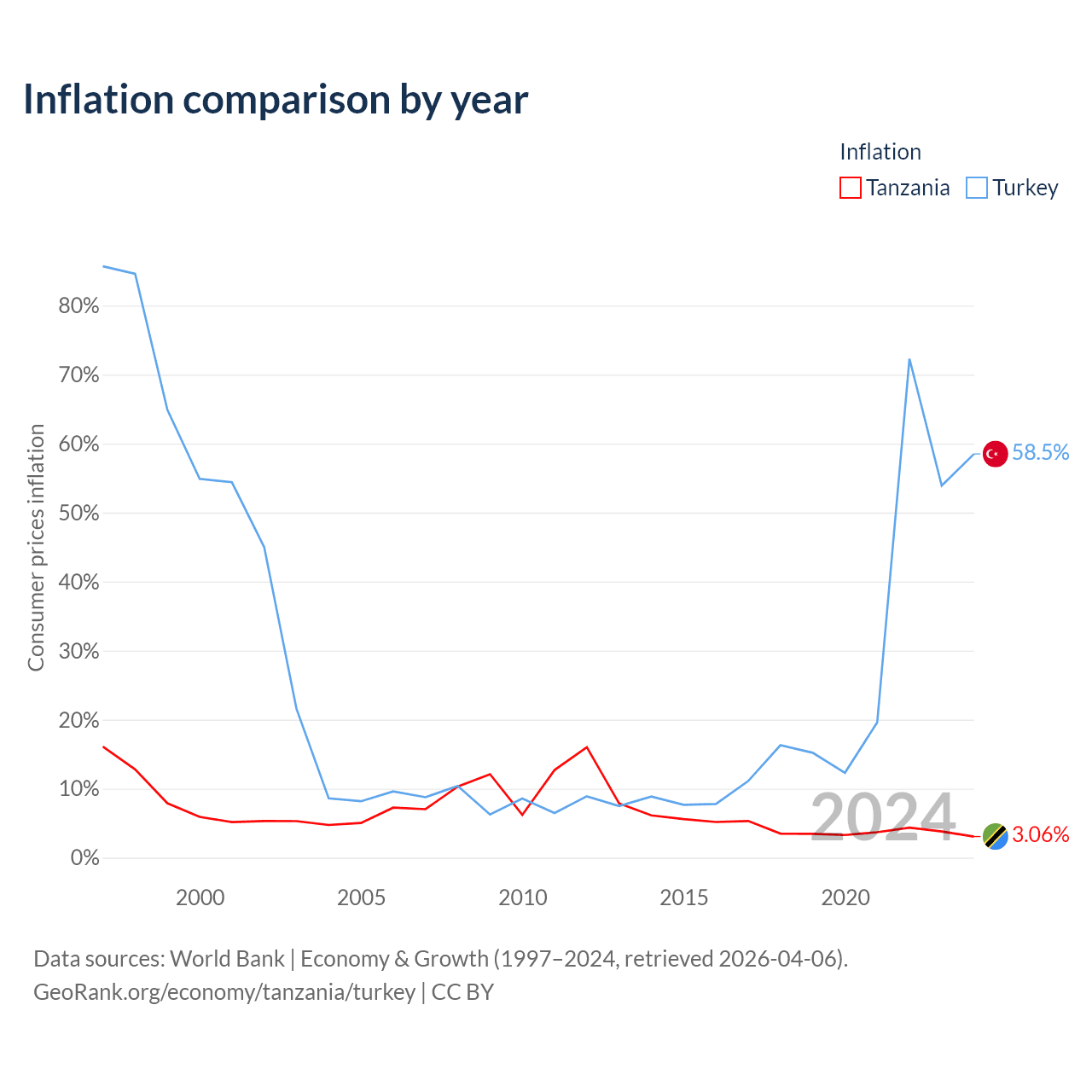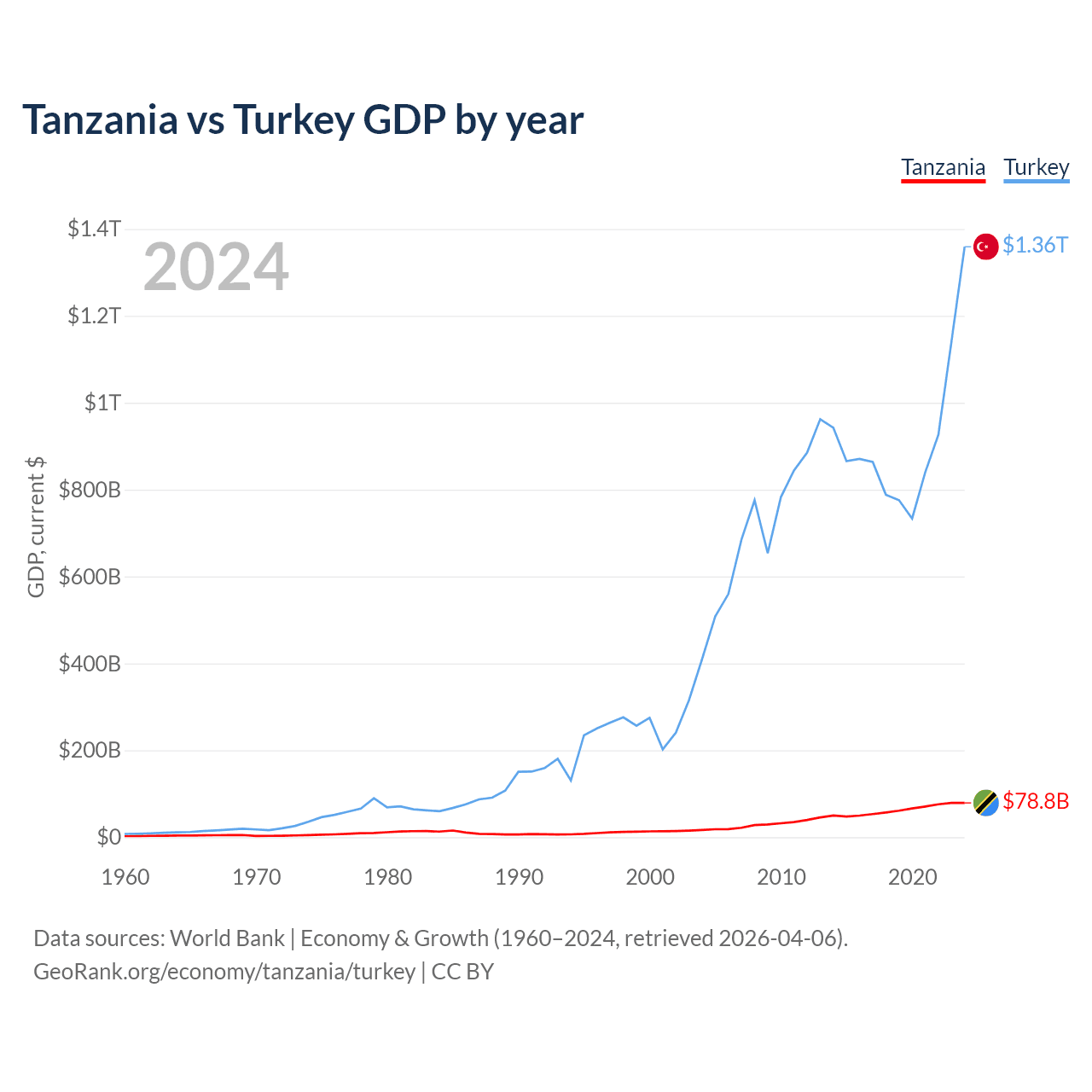 Tanzania has a GDP of $78.8B compared to $1.36T for Turkey, ranking 82/197 and 17/197 by economy size, respectively.