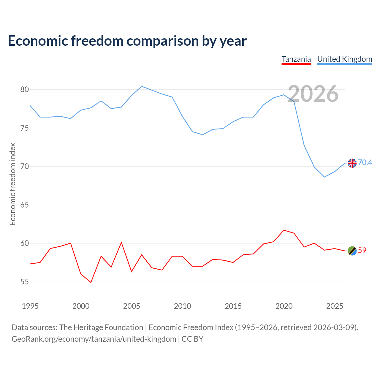 The Economic Freedom Index for Tanzania is 59, ranking 106/197, compared to 70.4 for the United Kingdom, ranking 35/197. The chart above displays a comparison of annual changes in economic freedom indexes.