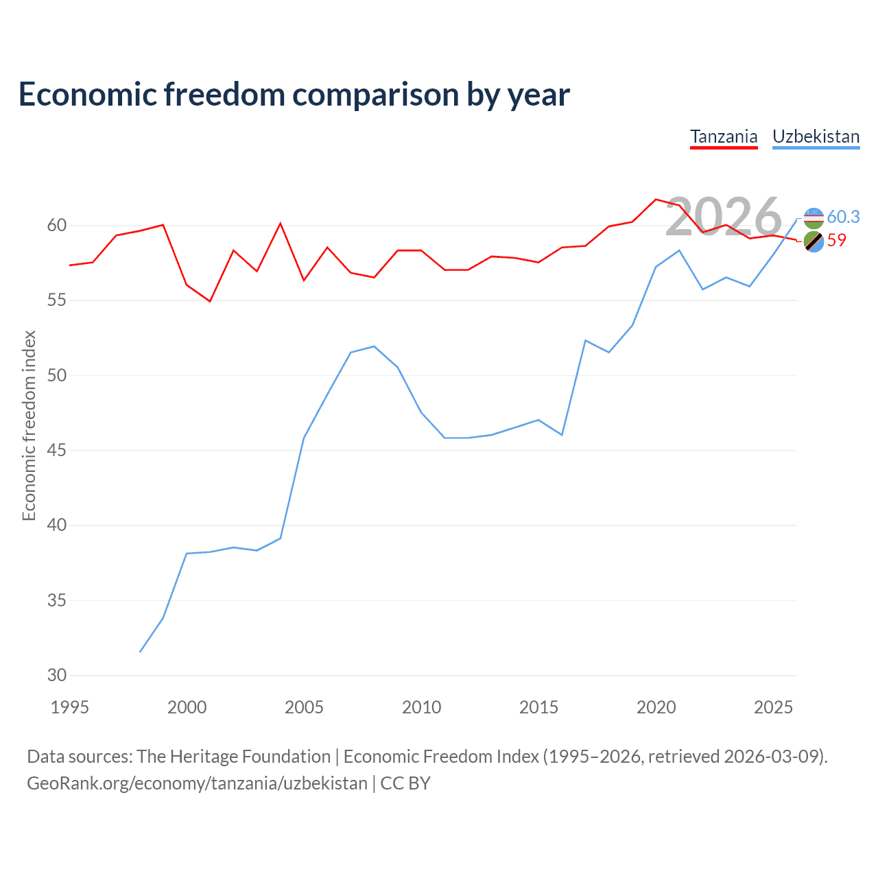 The Economic Freedom Index for Tanzania is 59, ranking 106/197, compared to 60.3 for Uzbekistan, ranking 94/197. The chart above displays a comparison of annual changes in economic freedom indexes.