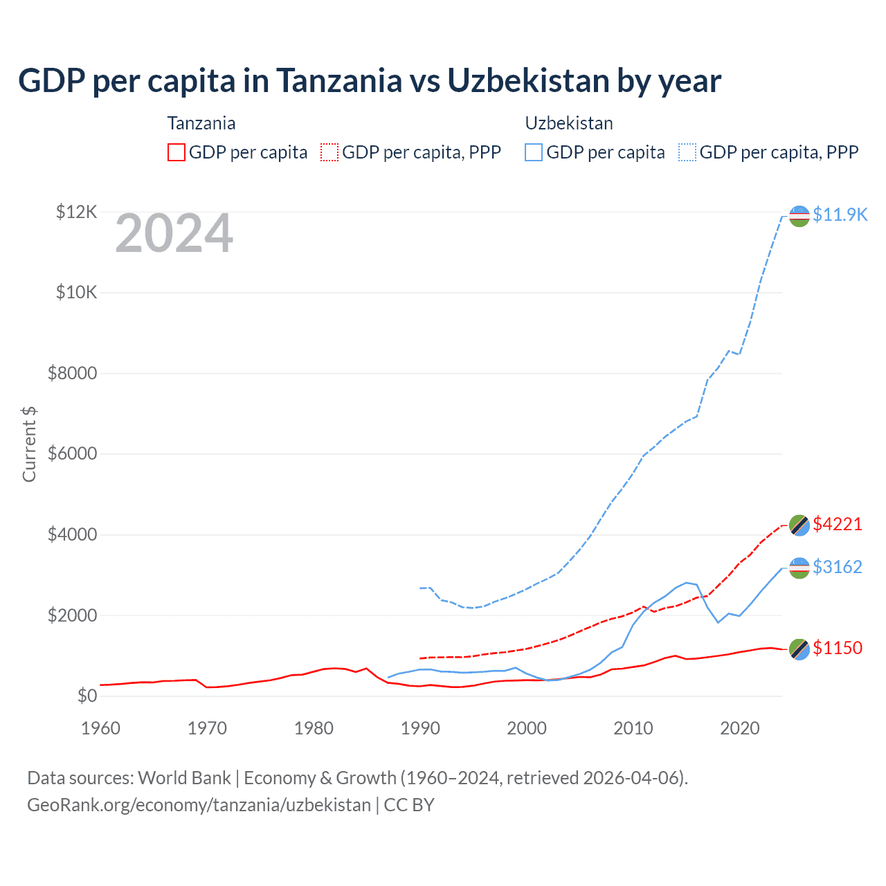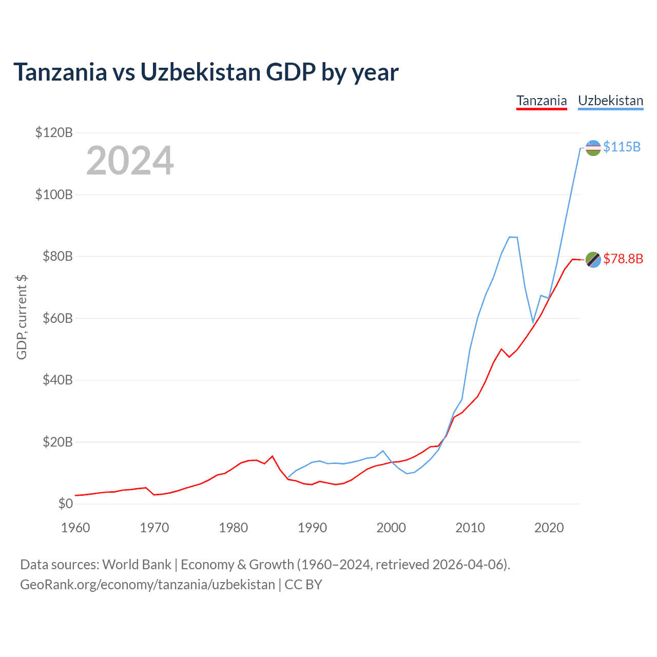 Tanzania has a GDP of $78.8B compared to $115B for Uzbekistan, ranking 82/197 and 66/197 by economy size, respectively.
