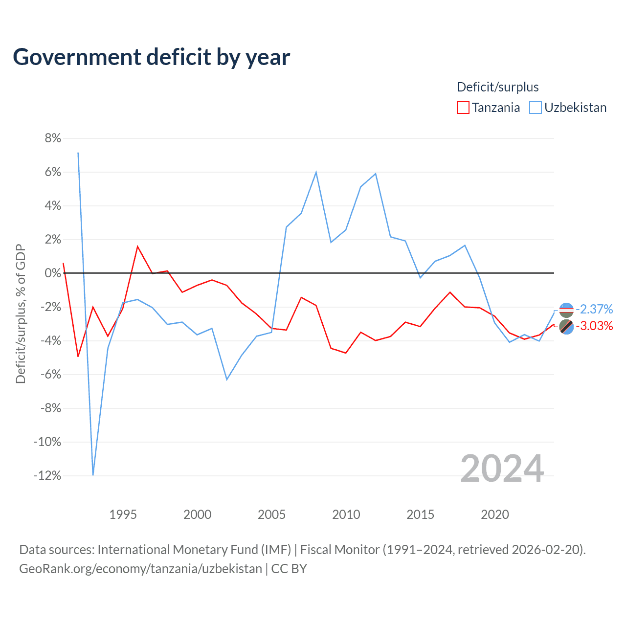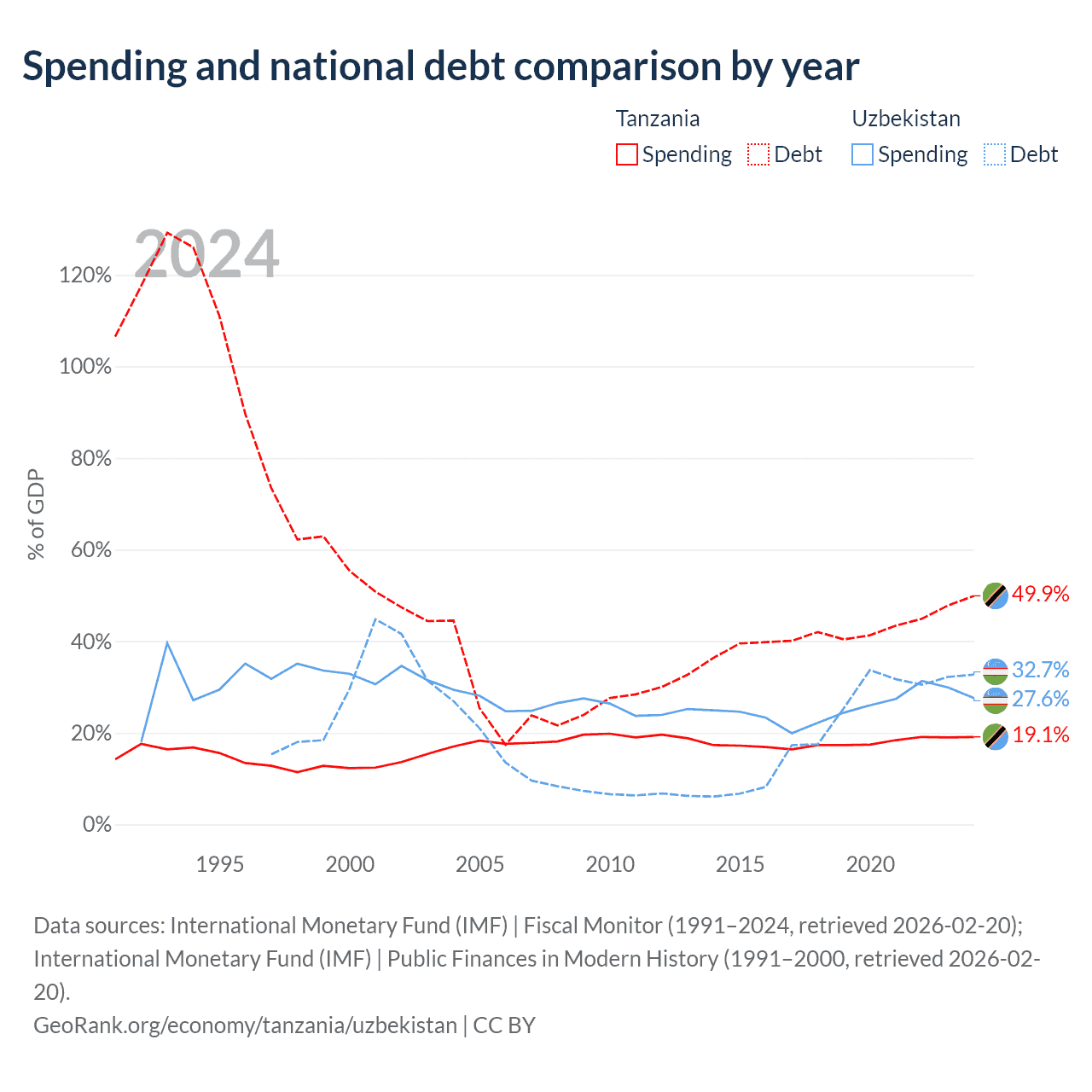 Tanzania has $39.3B in government debt (49.9% of GDP), compared to $37.5B (32.7% of GDP) in Uzbekistan.