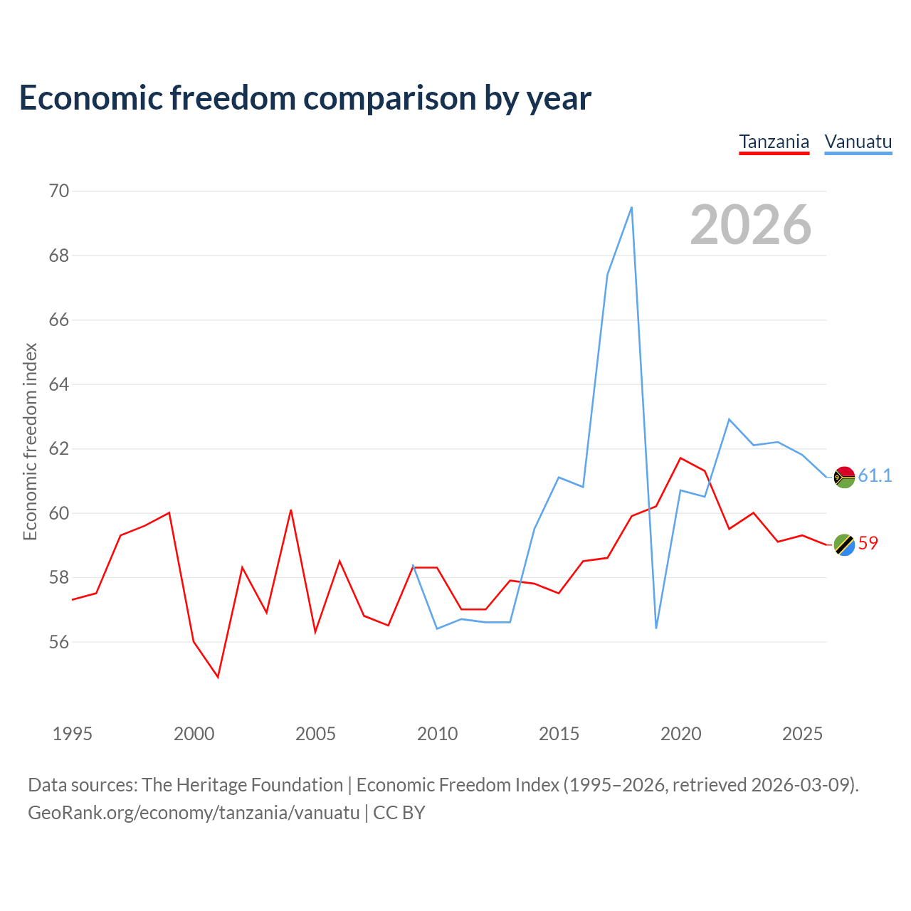 The Economic Freedom Index for Tanzania is 59, ranking 106/197, compared to 61.1 for Vanuatu, ranking 92/197. The chart above displays a comparison of annual changes in economic freedom indexes.