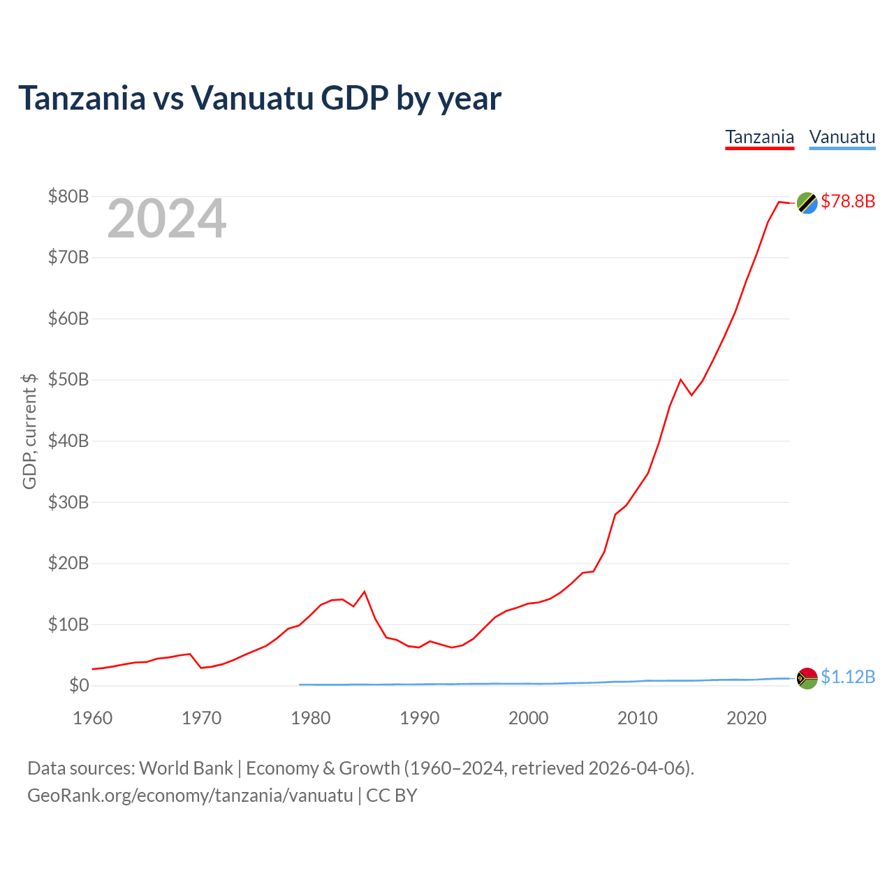 Tanzania has a GDP of $78.8B compared to $1.12B for Vanuatu, ranking 82/197 and 188/197 by economy size, respectively.