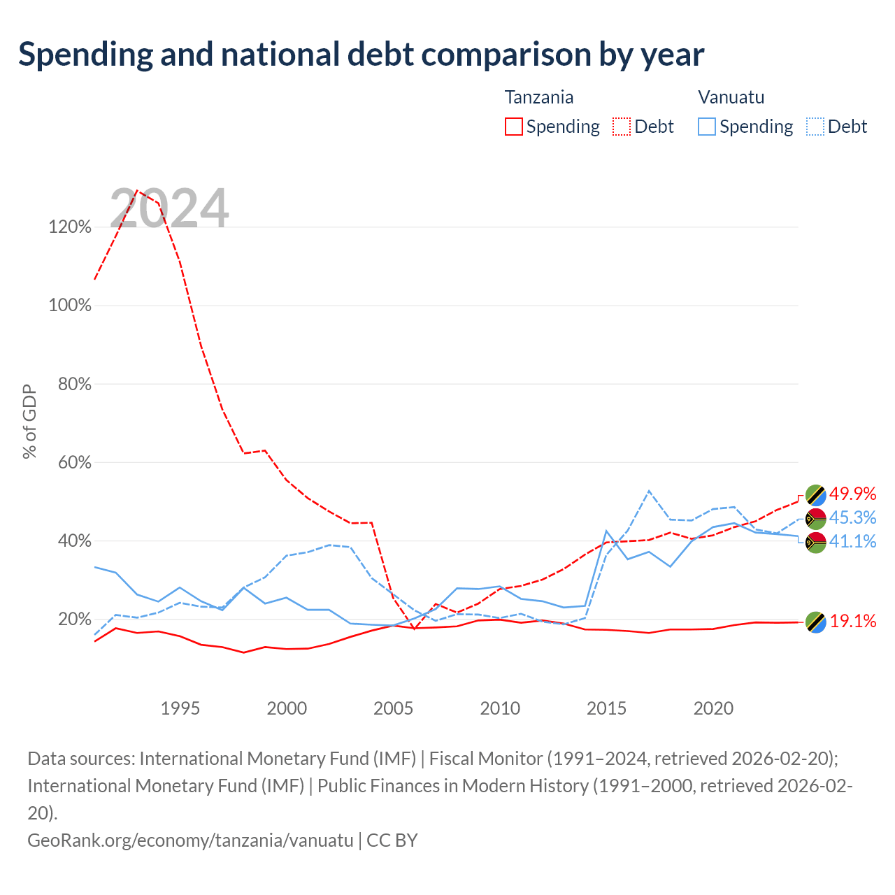 Tanzania has $39.3B in government debt (49.9% of GDP), compared to $507M (45.3% of GDP) in Vanuatu.