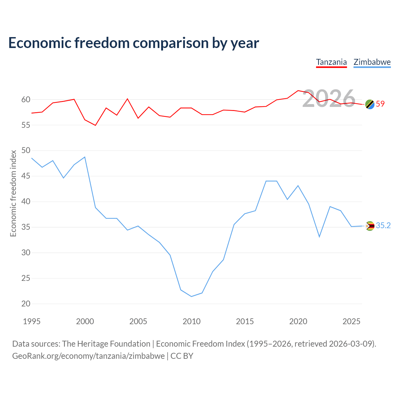 The Economic Freedom Index for Tanzania is 59, ranking 106/197, compared to 35.2 for Zimbabwe, ranking 190/197. The chart above displays a comparison of annual changes in economic freedom indexes.