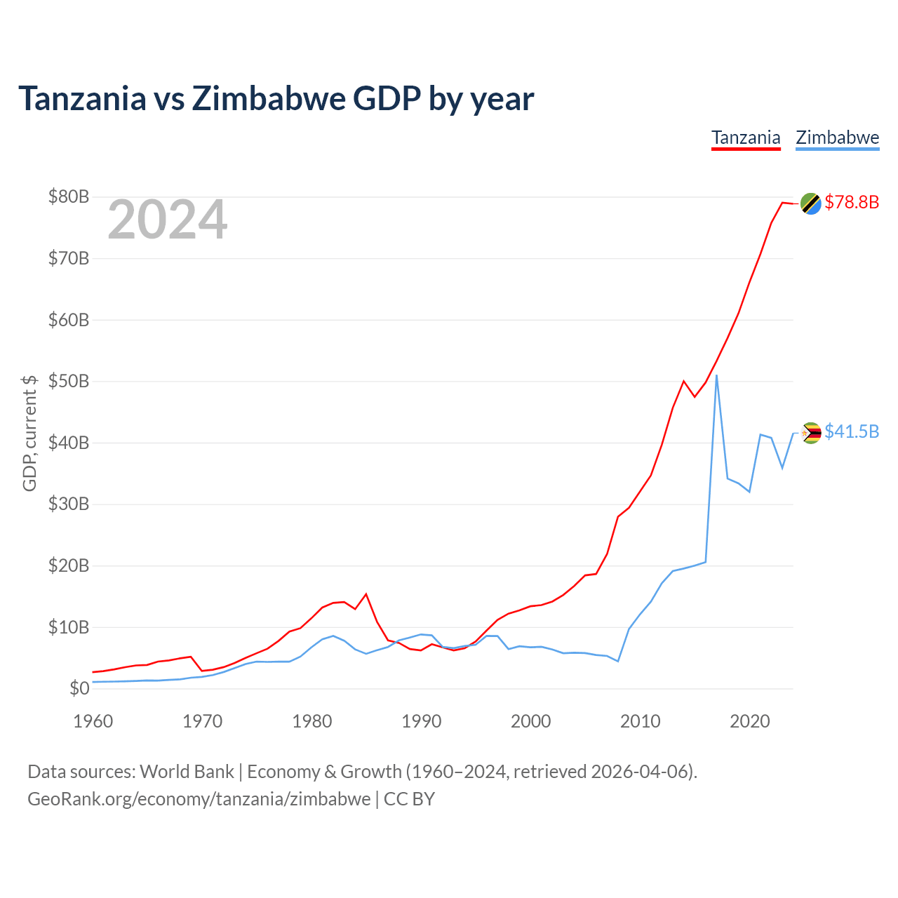 Tanzania has a GDP of $78.8B compared to $41.5B for Zimbabwe, ranking 82/197 and 102/197 by economy size, respectively.