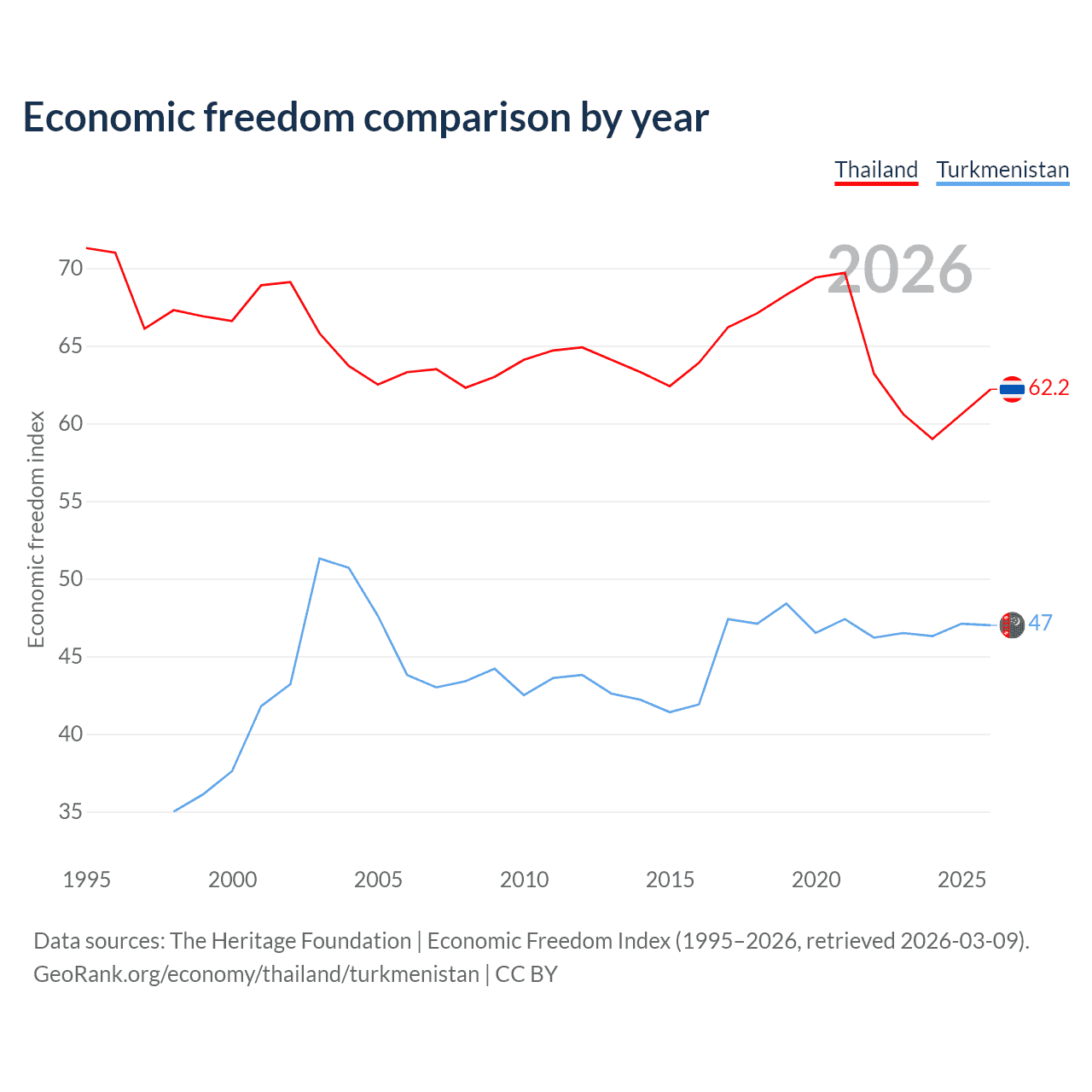 The Economic Freedom Index for Thailand is 62.2, ranking 88/197, compared to 47 for Turkmenistan, ranking 177/197. The chart above displays a comparison of annual changes in economic freedom indexes.