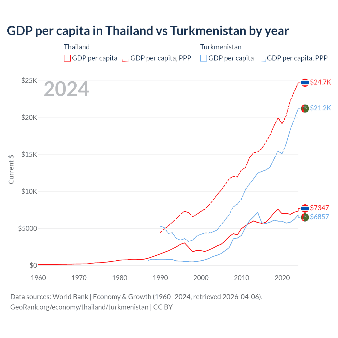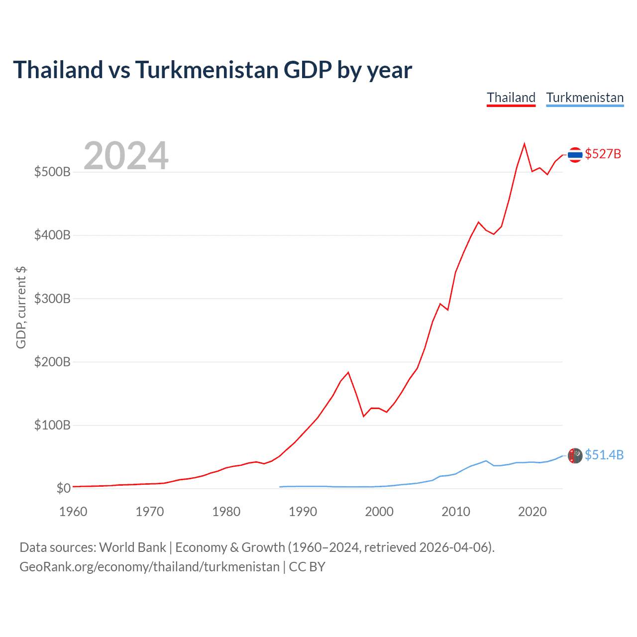 Thailand has a GDP of $527B compared to $51.4B for Turkmenistan, ranking 31/197 and 92/197 by economy size, respectively.