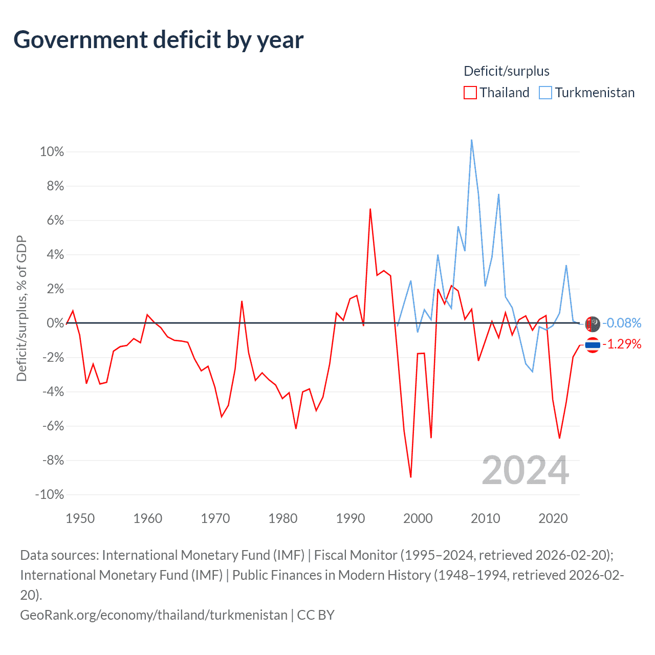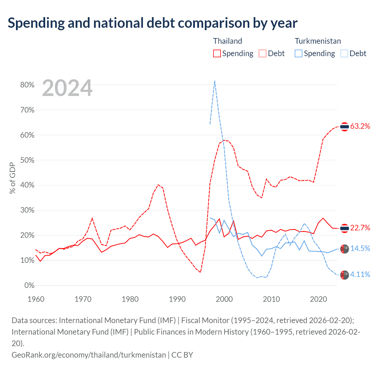 Thailand has $333B in government debt (63.2% of GDP), compared to $2.11B (4.11% of GDP) in Turkmenistan.