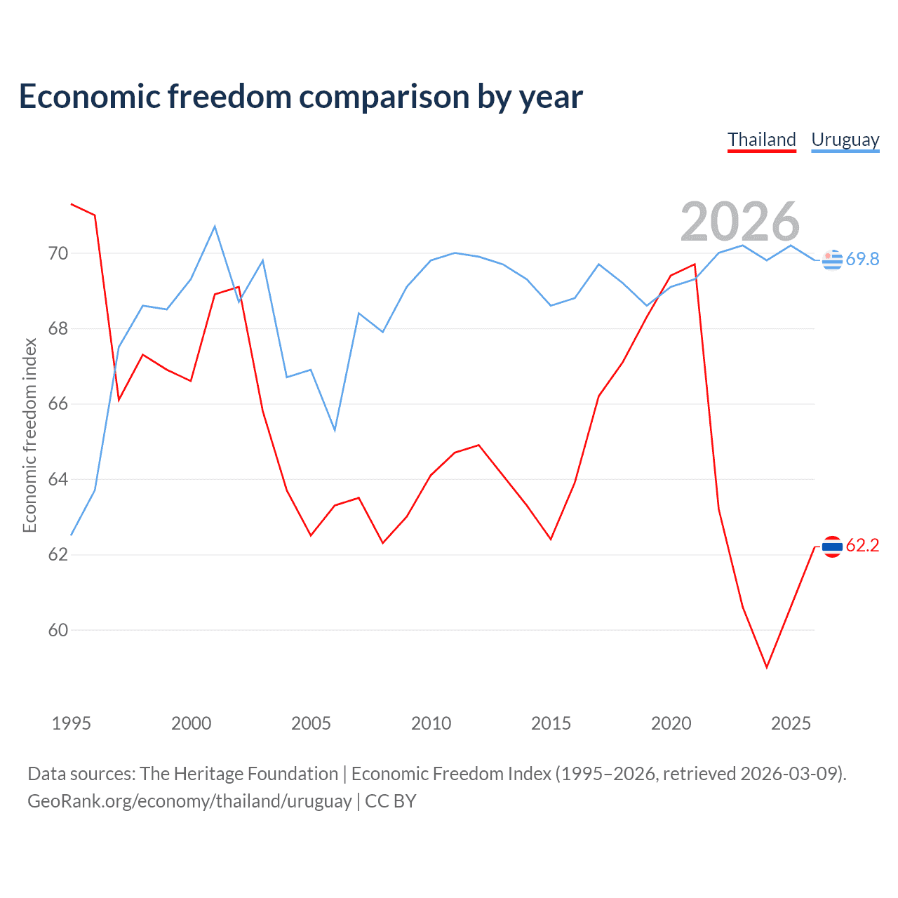 The Economic Freedom Index for Thailand is 62.2, ranking 88/197, compared to 69.8 for Uruguay, ranking 39/197. The chart above displays a comparison of annual changes in economic freedom indexes.
