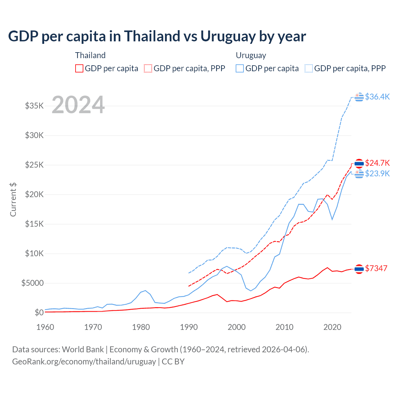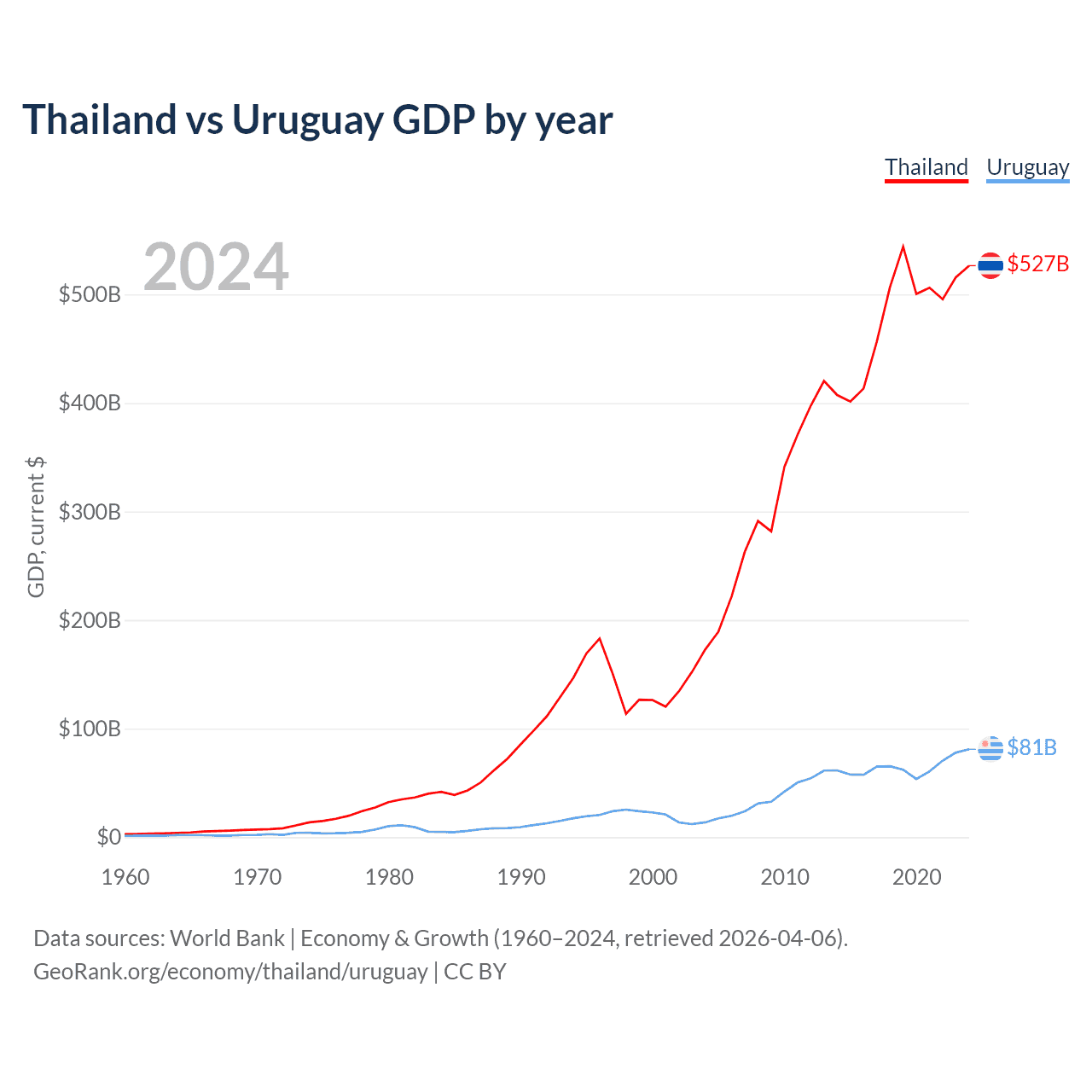 Thailand has a GDP of $527B compared to $81B for Uruguay, ranking 31/197 and 81/197 by economy size, respectively.