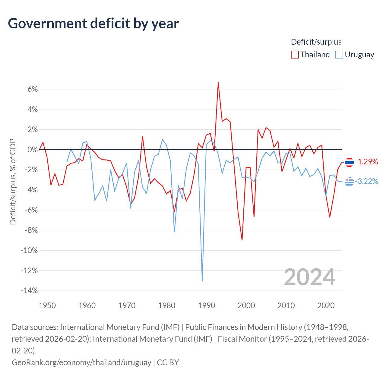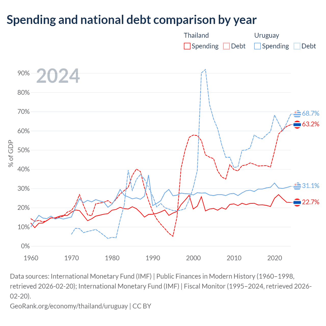 Thailand has $333B in government debt (63.2% of GDP), compared to $55.6B (68.7% of GDP) in Uruguay.
