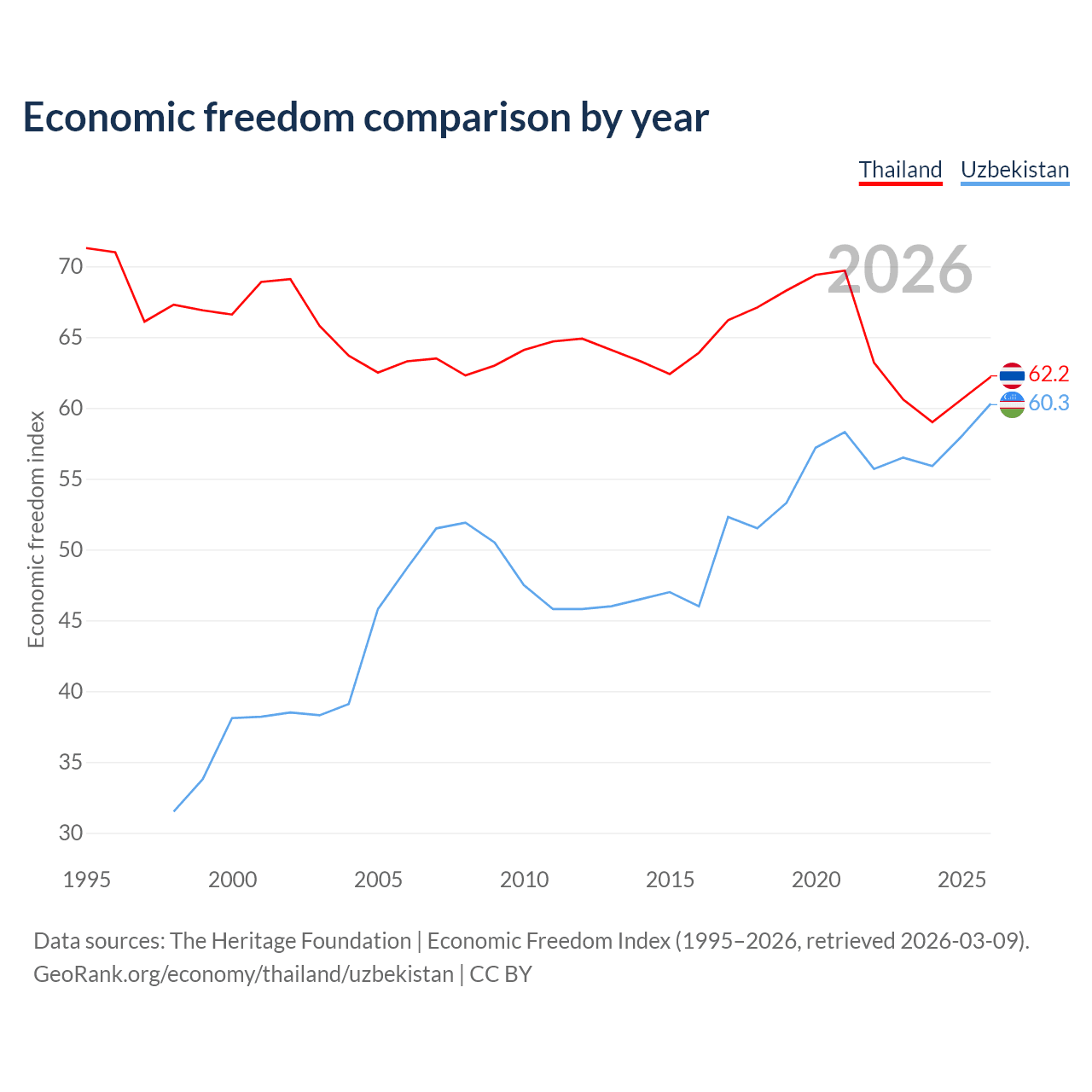 The Economic Freedom Index for Thailand is 62.2, ranking 88/197, compared to 60.3 for Uzbekistan, ranking 94/197. The chart above displays a comparison of annual changes in economic freedom indexes.