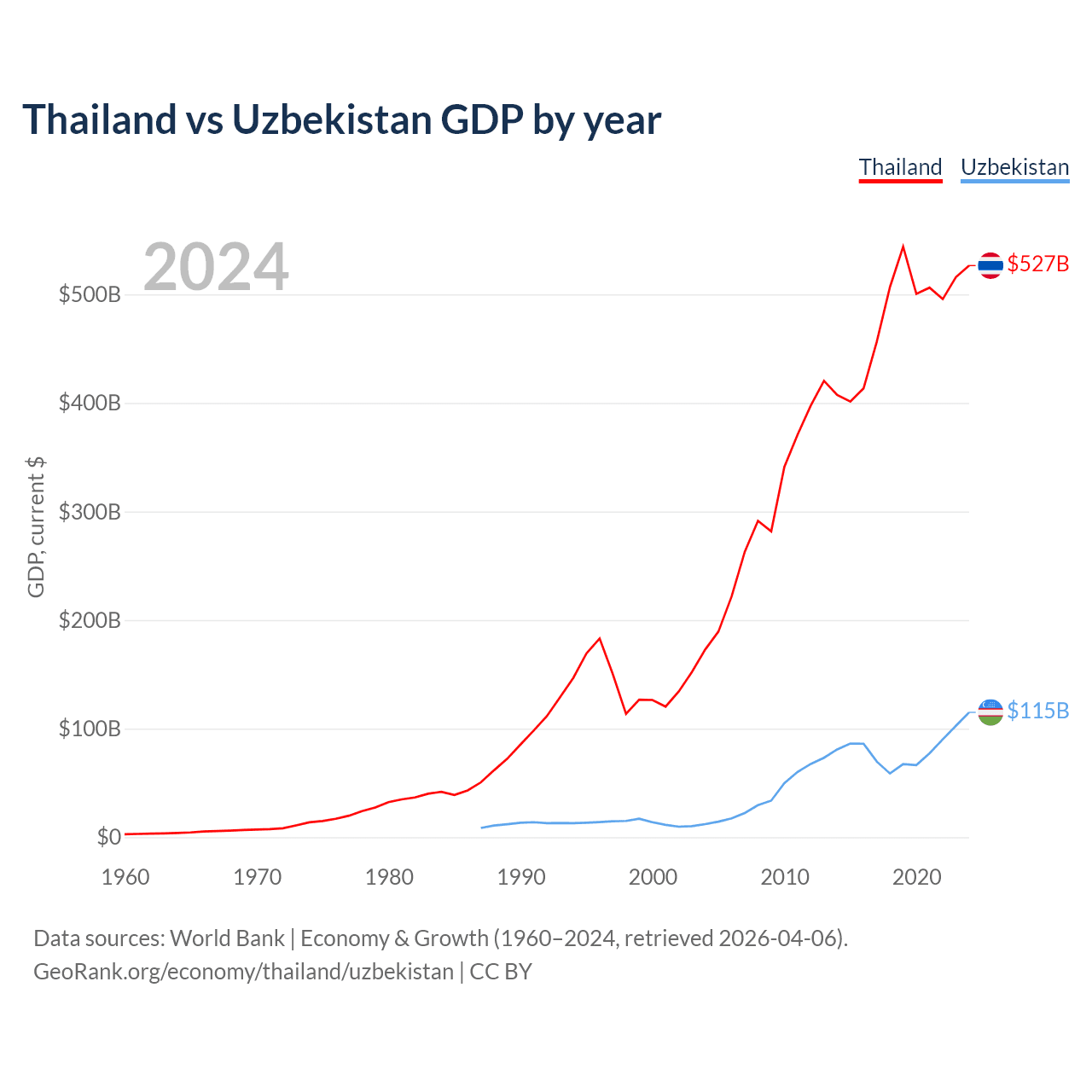 Thailand has a GDP of $527B compared to $115B for Uzbekistan, ranking 31/197 and 66/197 by economy size, respectively.