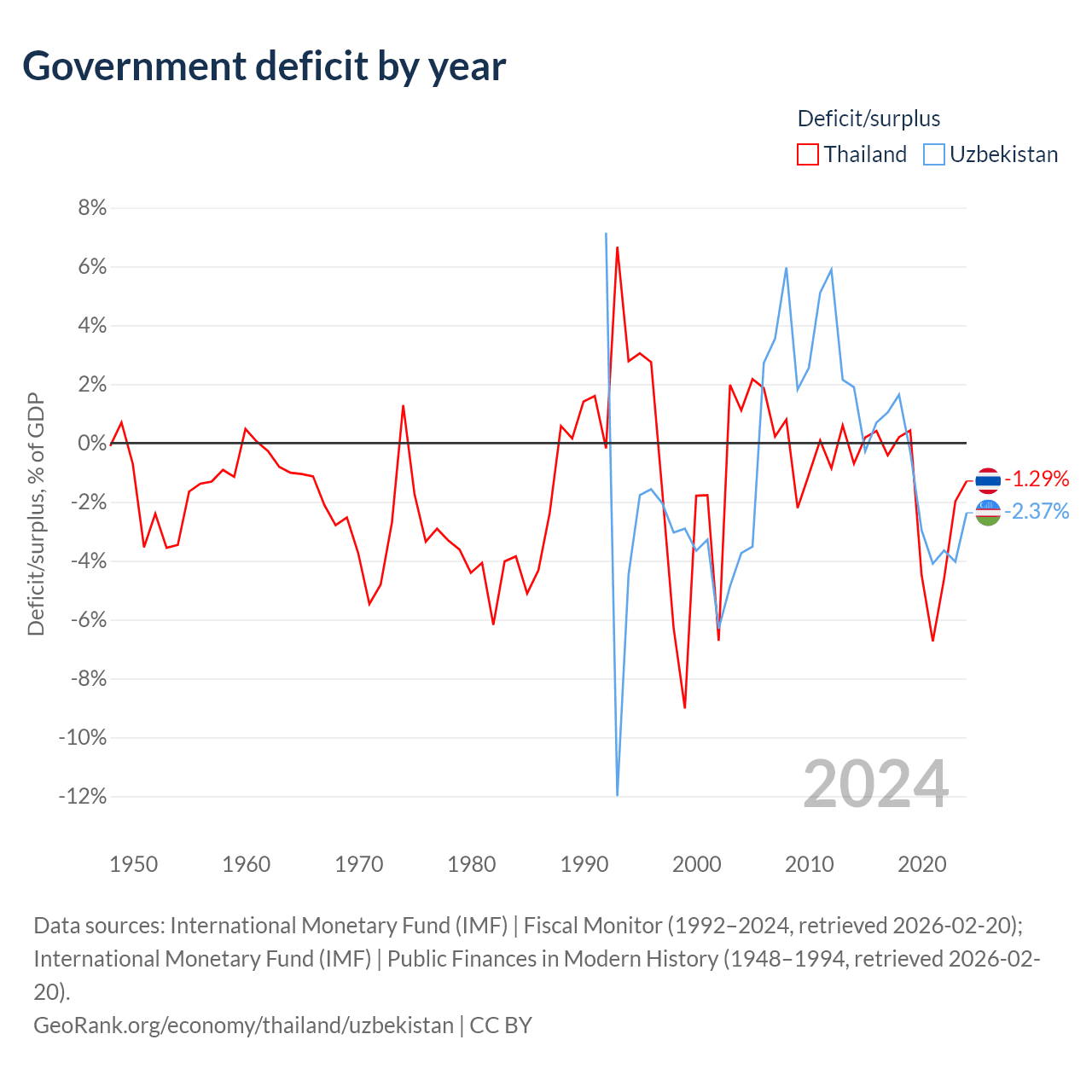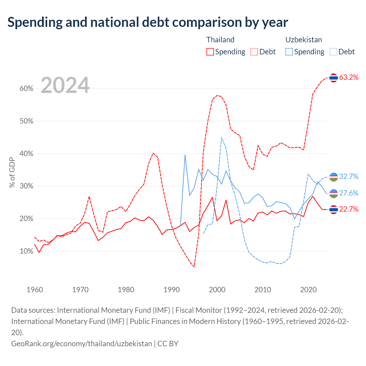 Thailand has $333B in government debt (63.2% of GDP), compared to $37.5B (32.7% of GDP) in Uzbekistan.