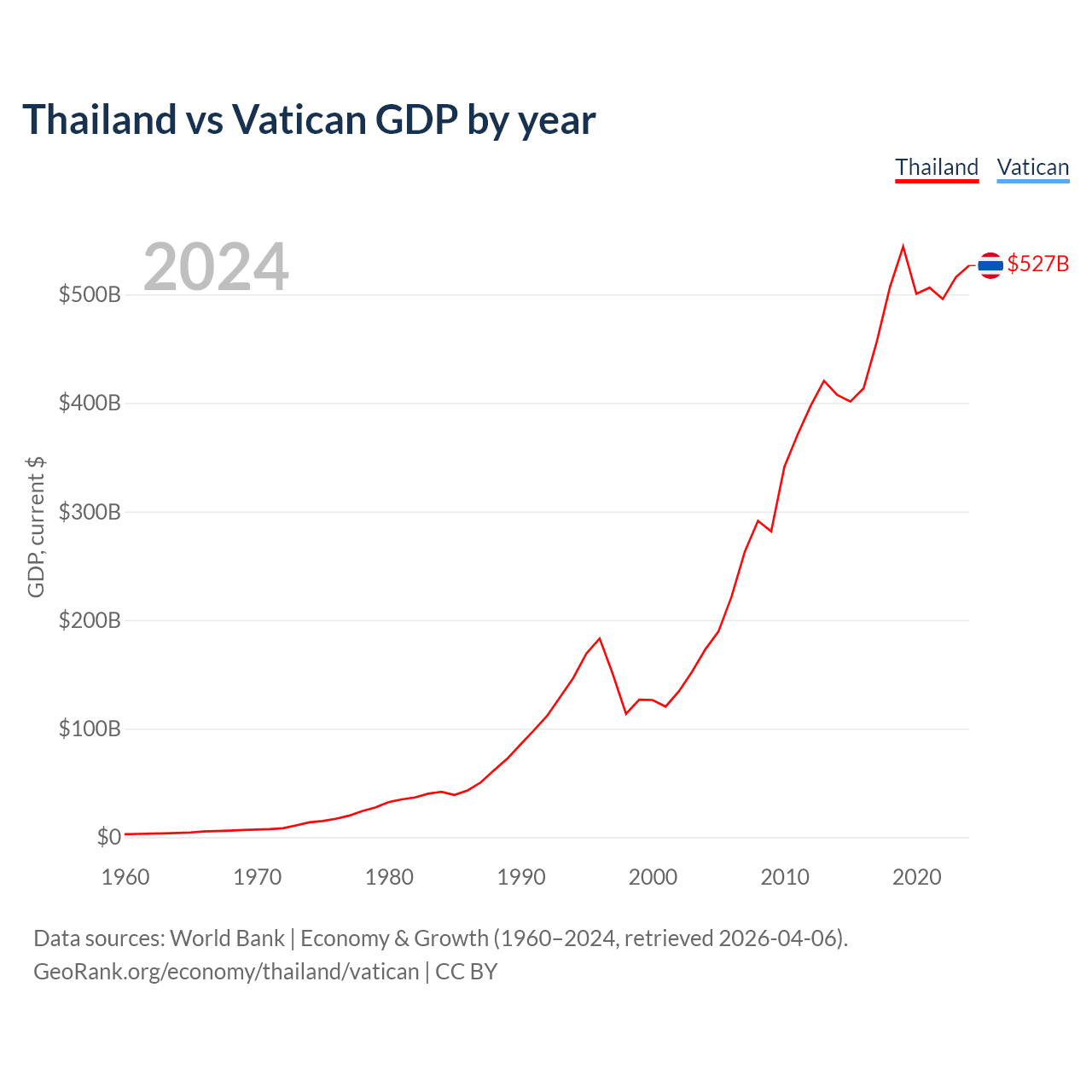 Thailand has a GDP of $527B compared to $19.8M for the Vatican, ranking 31/197 and 197/197 by economy size, respectively.