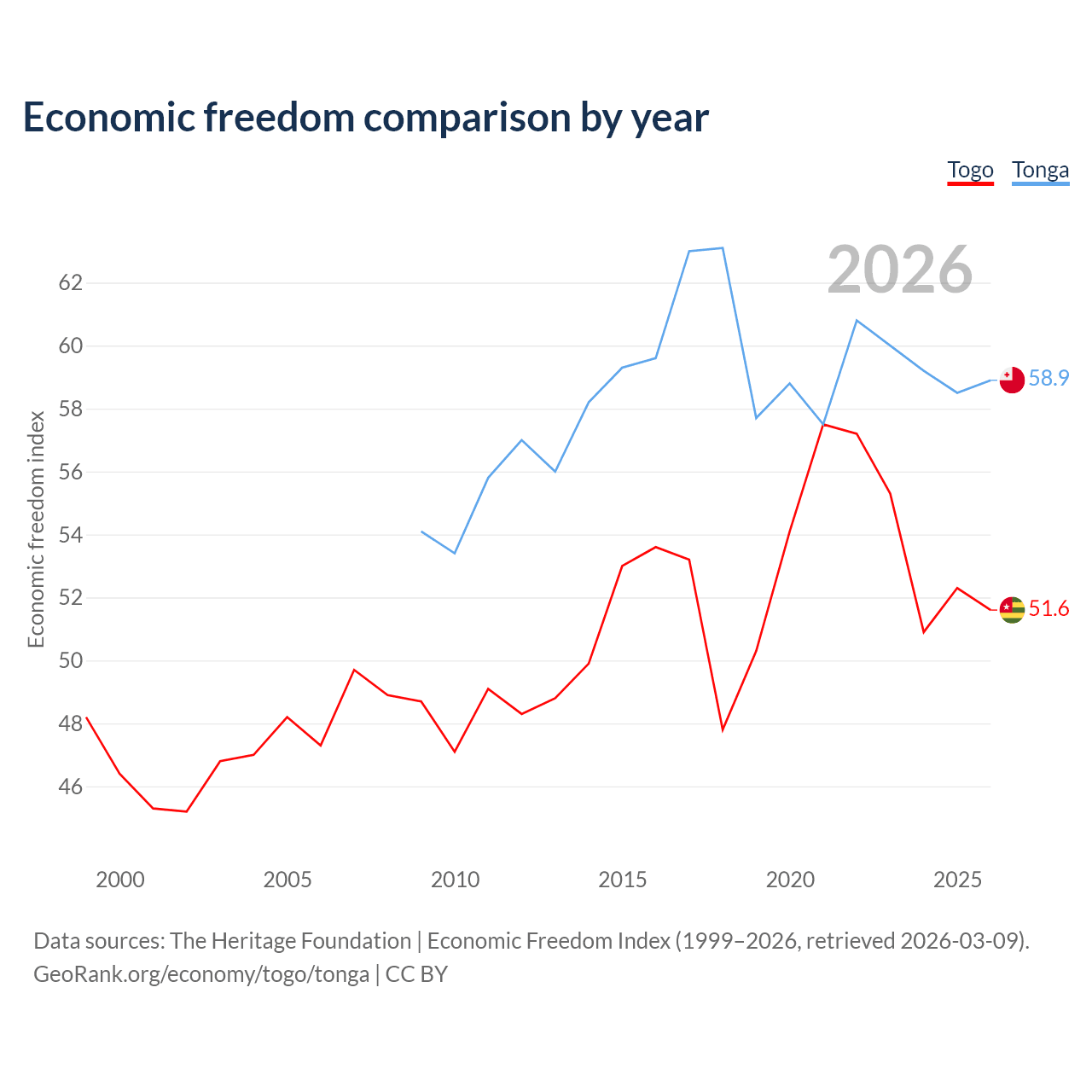 The Economic Freedom Index for Togo is 51.6, ranking 153/197, compared to 58.9 for Tonga, ranking 107/197. The chart above displays a comparison of annual changes in economic freedom indexes.