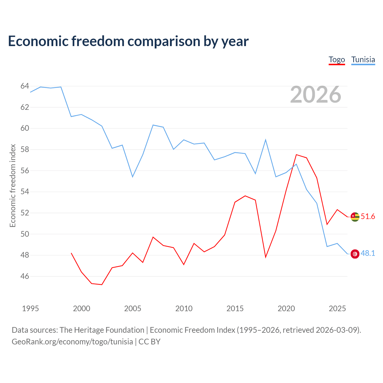The Economic Freedom Index for Togo is 51.6, ranking 153/197, compared to 48.1 for Tunisia, ranking 172/197. The chart above displays a comparison of annual changes in economic freedom indexes.