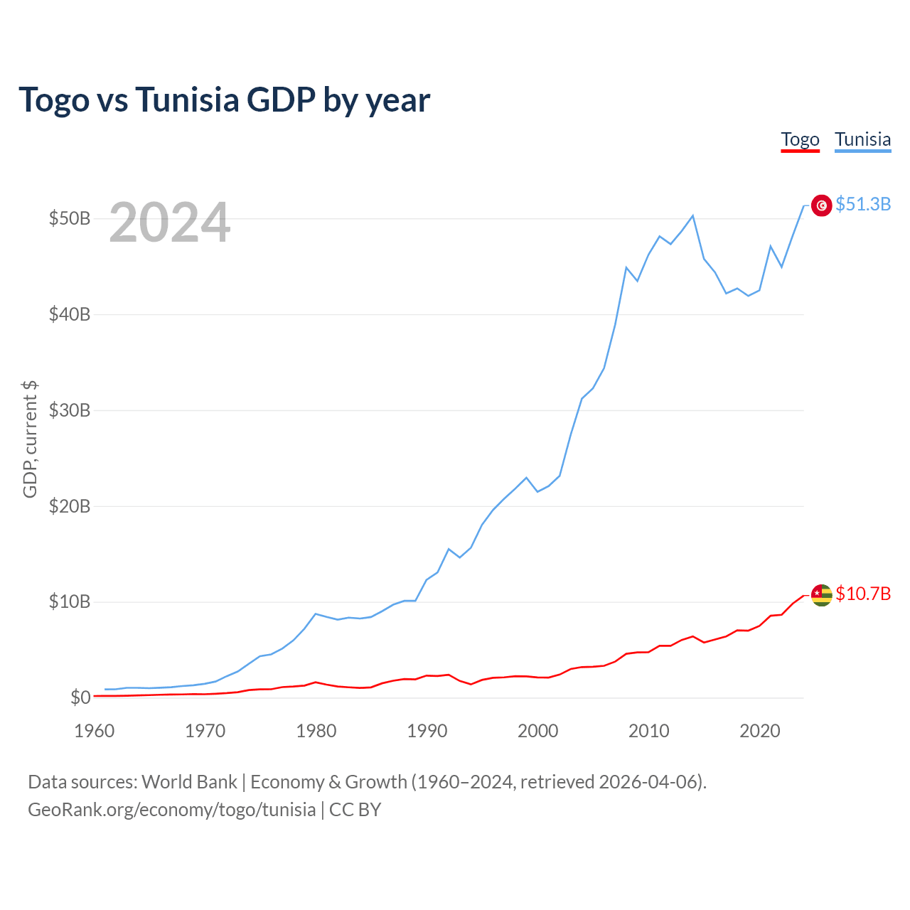 Togo has a GDP of $10.7B compared to $51.3B for Tunisia, ranking 154/197 and 93/197 by economy size, respectively.