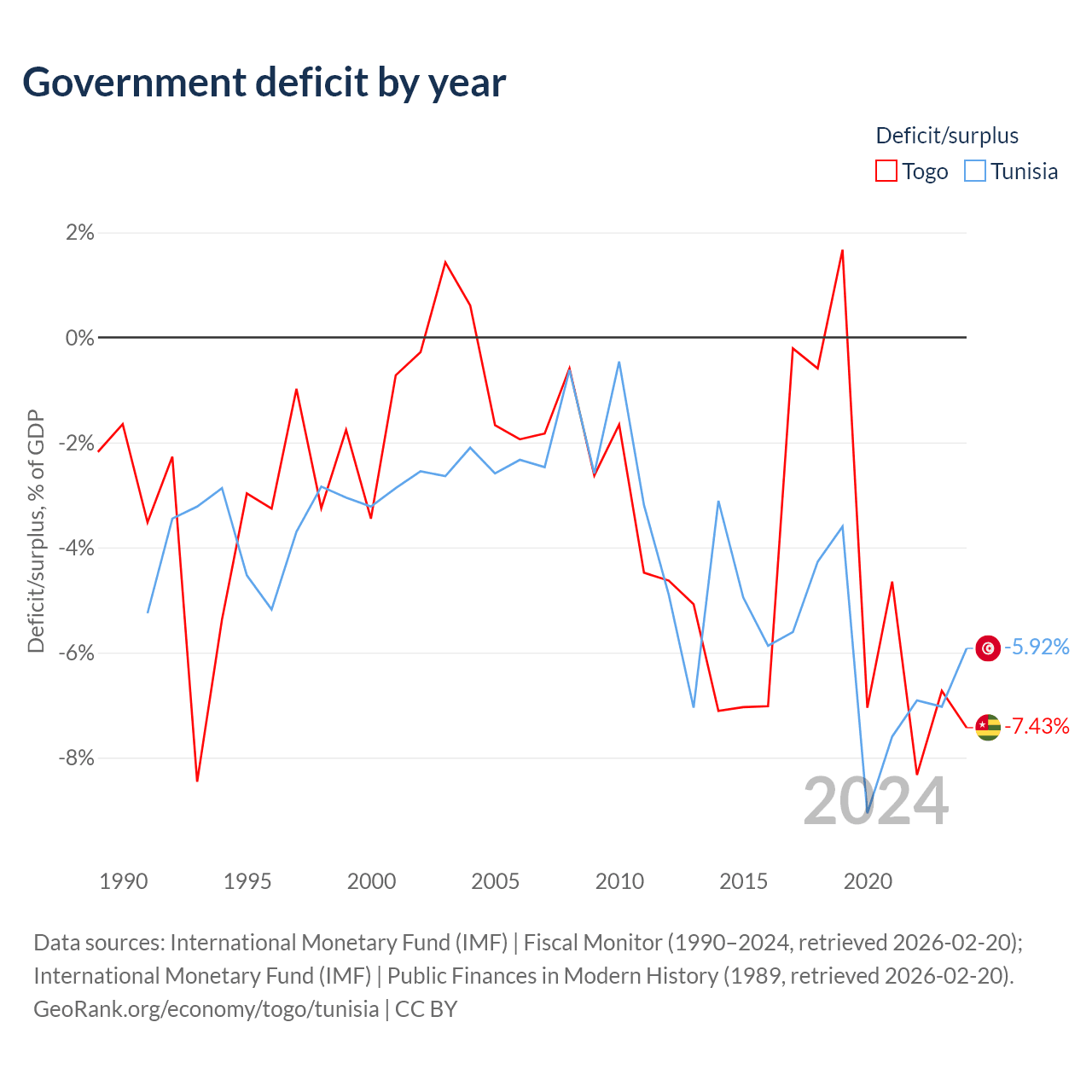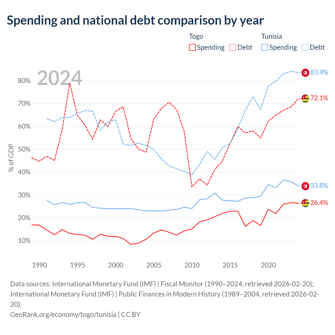 Togo has $7.68B in government debt (72.1% of GDP), compared to $42.8B (83.4% of GDP) in Tunisia.