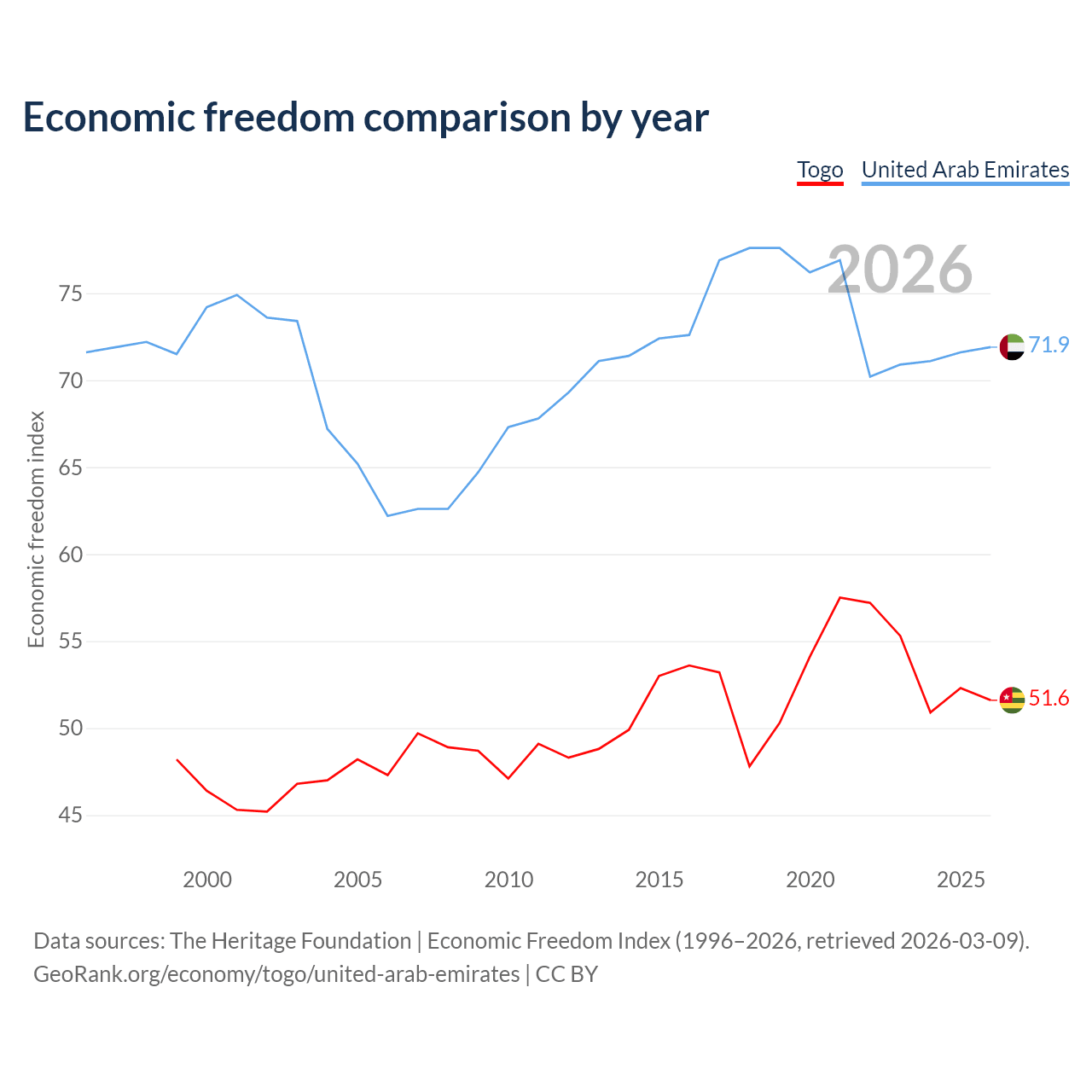 The Economic Freedom Index for Togo is 51.6, ranking 153/197, compared to 71.9 for the United Arab Emirates, ranking 29/197. The chart above displays a comparison of annual changes in economic freedom indexes.