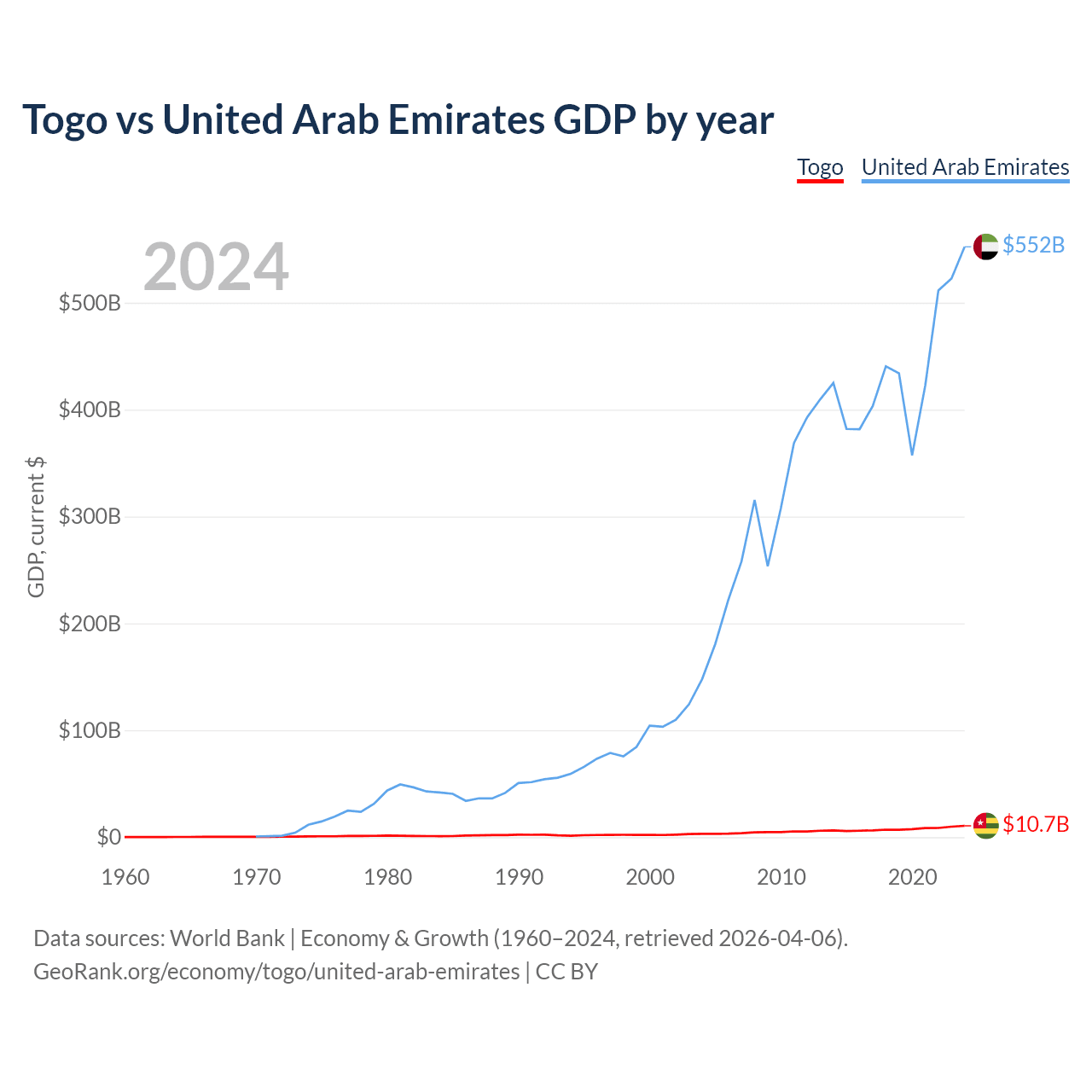 Togo has a GDP of $10.7B compared to $552B for the United Arab Emirates, ranking 154/197 and 27/197 by economy size, respectively.