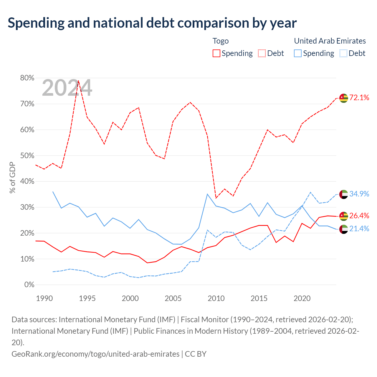 Togo has $7.68B in government debt (72.1% of GDP), compared to $193B (34.9% of GDP) in the United Arab Emirates.
