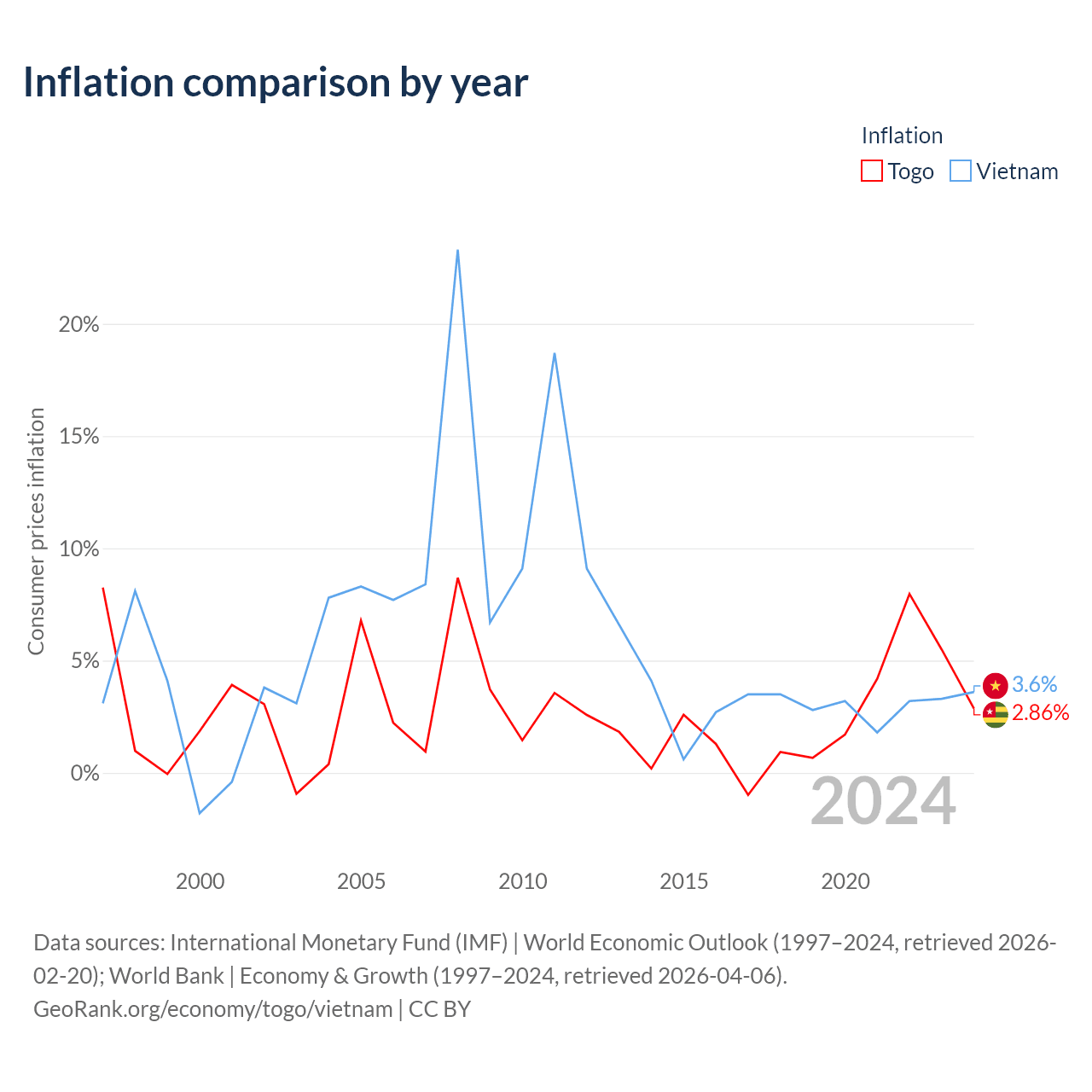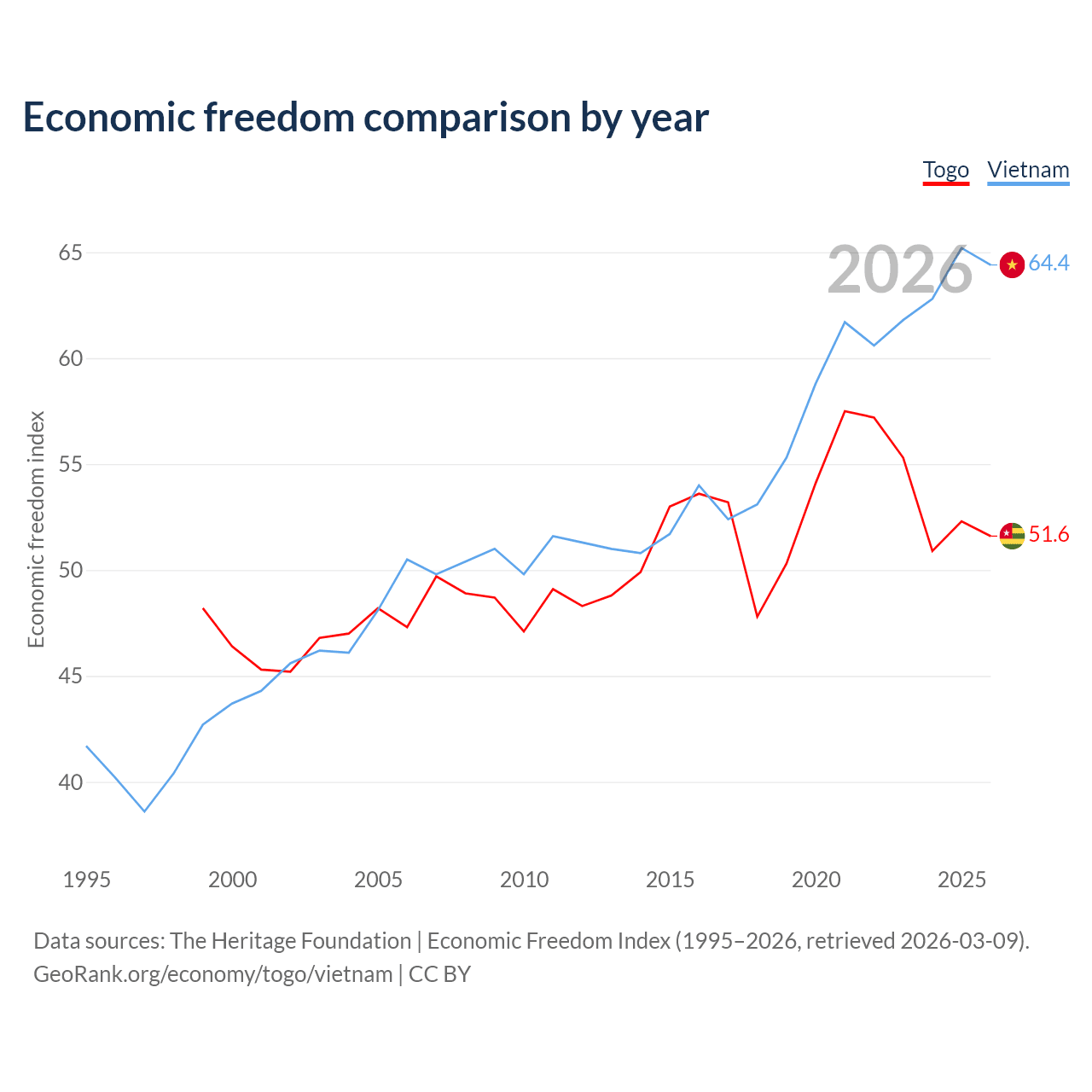 The Economic Freedom Index for Togo is 51.6, ranking 153/197, compared to 64.4 for Vietnam, ranking 73/197. The chart above displays a comparison of annual changes in economic freedom indexes.