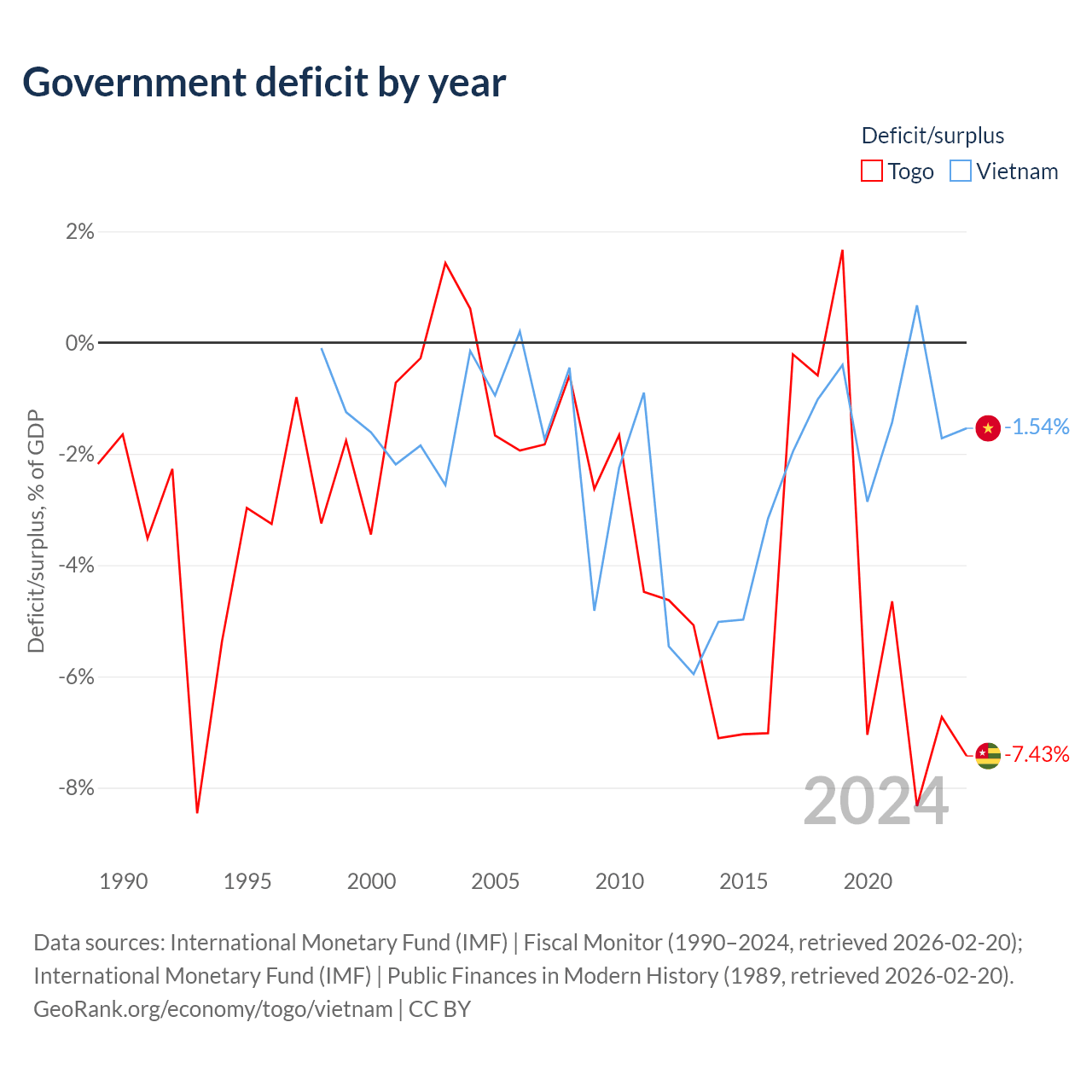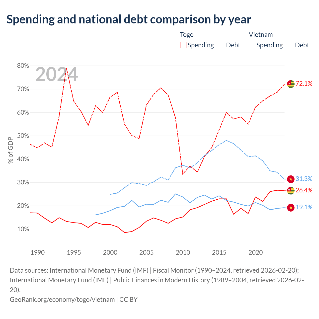 Togo has $7.68B in government debt (72.1% of GDP), compared to $149B (31.3% of GDP) in Vietnam.