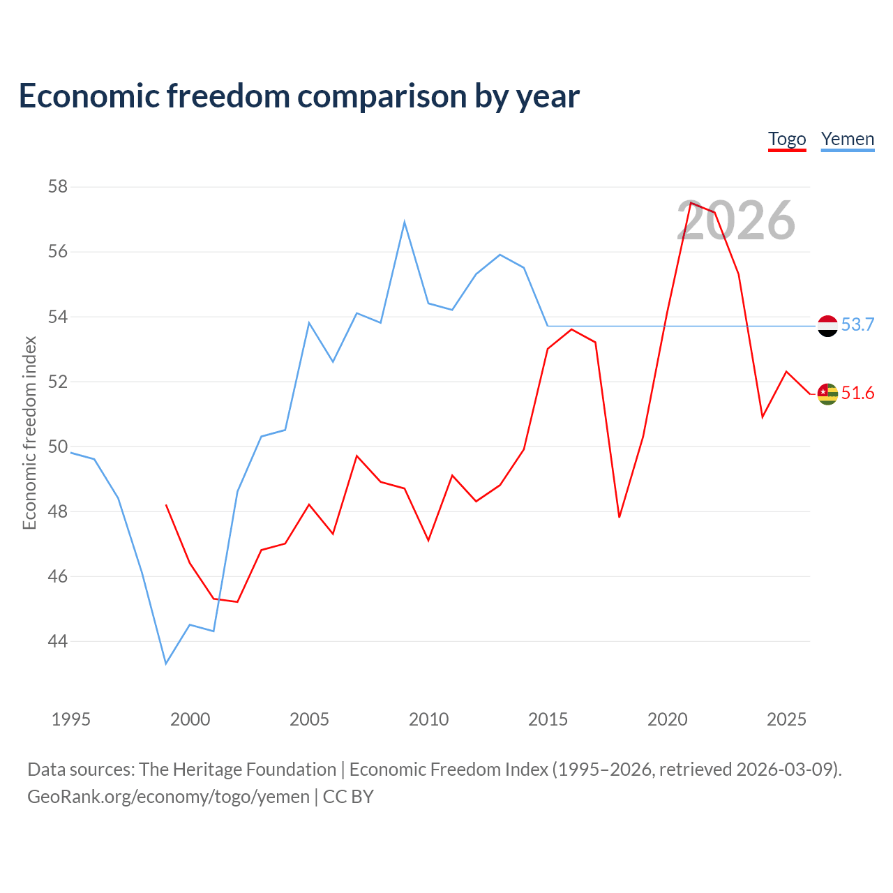 The Economic Freedom Index for Togo is 51.6, ranking 153/197, compared to 53.7 for Yemen, ranking 138/197. The chart above displays a comparison of annual changes in economic freedom indexes.