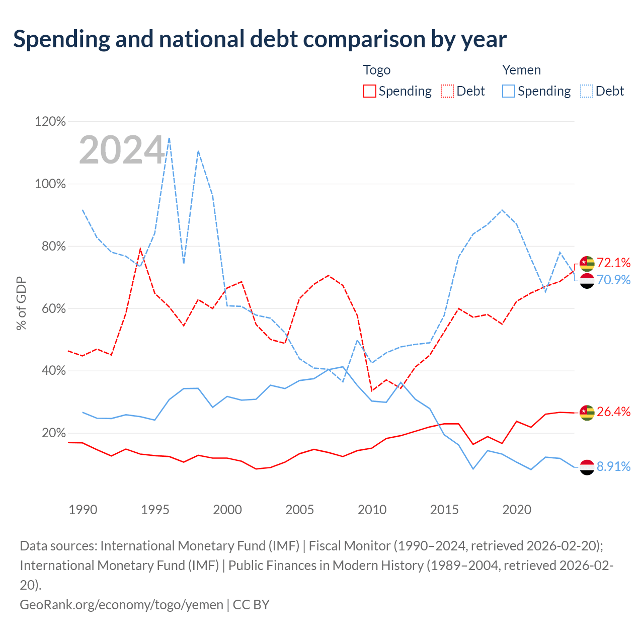 Togo has $7.68B in government debt (72.1% of GDP), compared to $18.8B (70.9% of GDP) in Yemen.