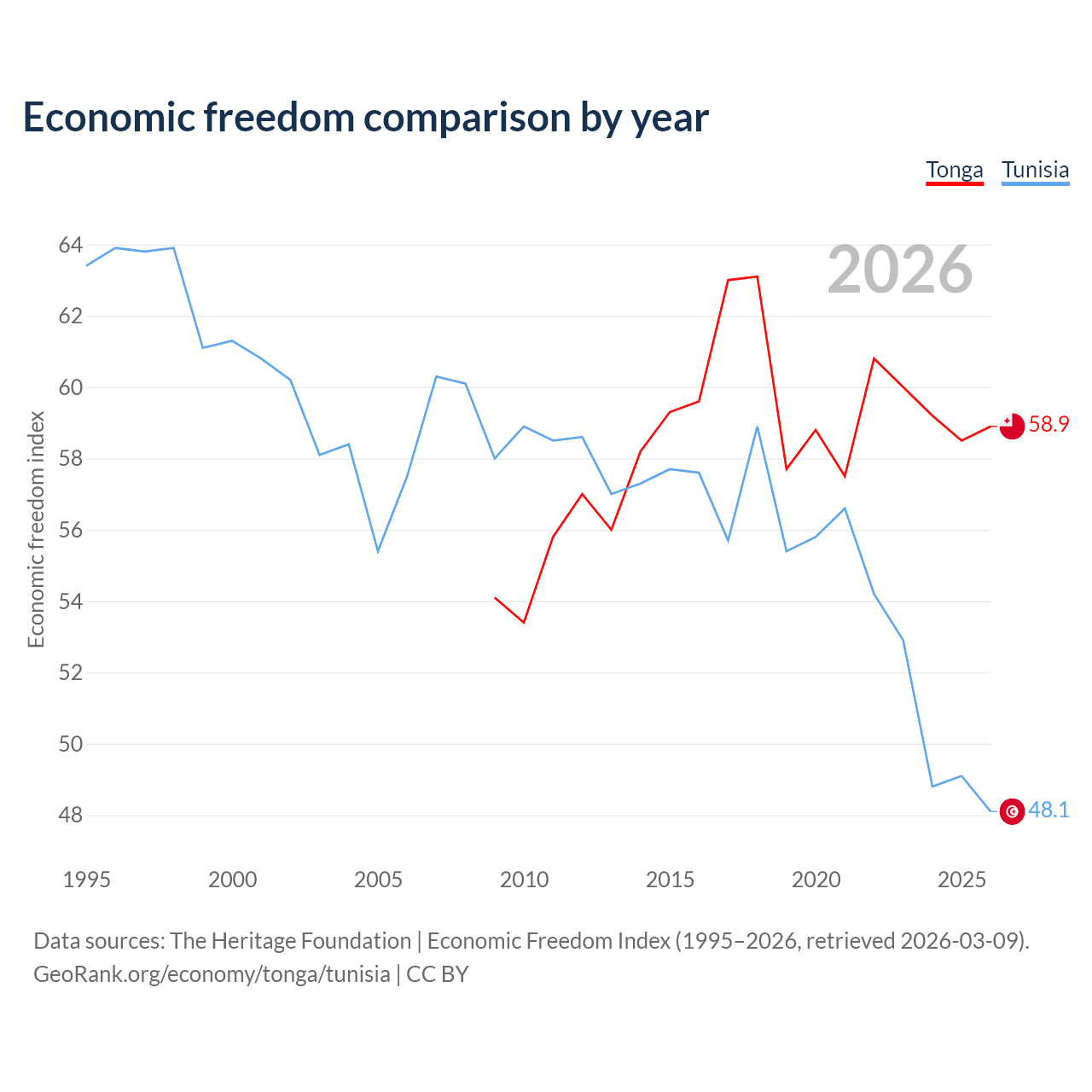 The Economic Freedom Index for Tonga is 58.9, ranking 107/197, compared to 48.1 for Tunisia, ranking 172/197. The chart above displays a comparison of annual changes in economic freedom indexes.
