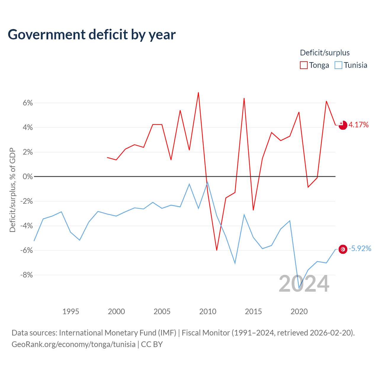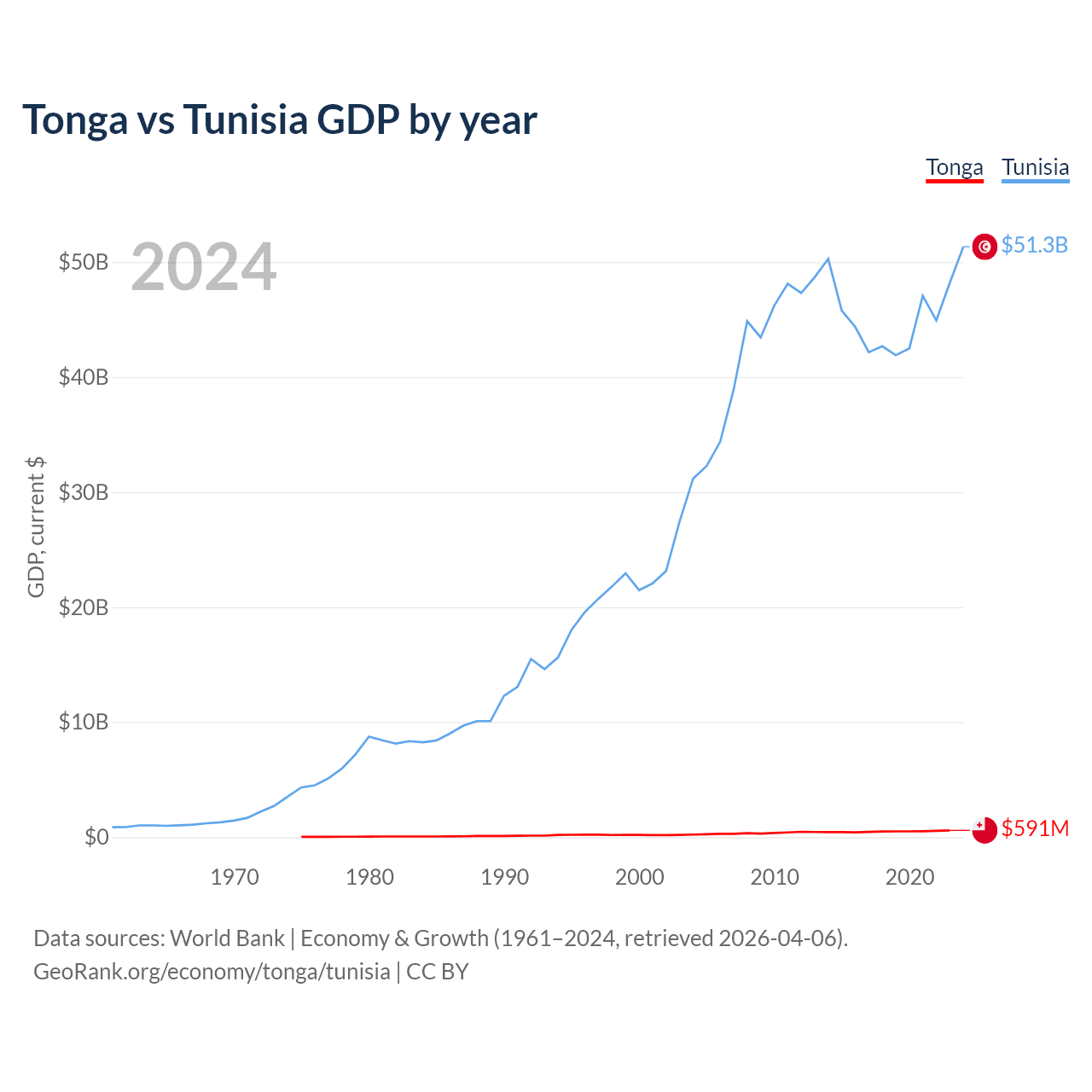 Tonga has a GDP of $591M compared to $51.3B for Tunisia, ranking 191/197 and 93/197 by economy size, respectively.