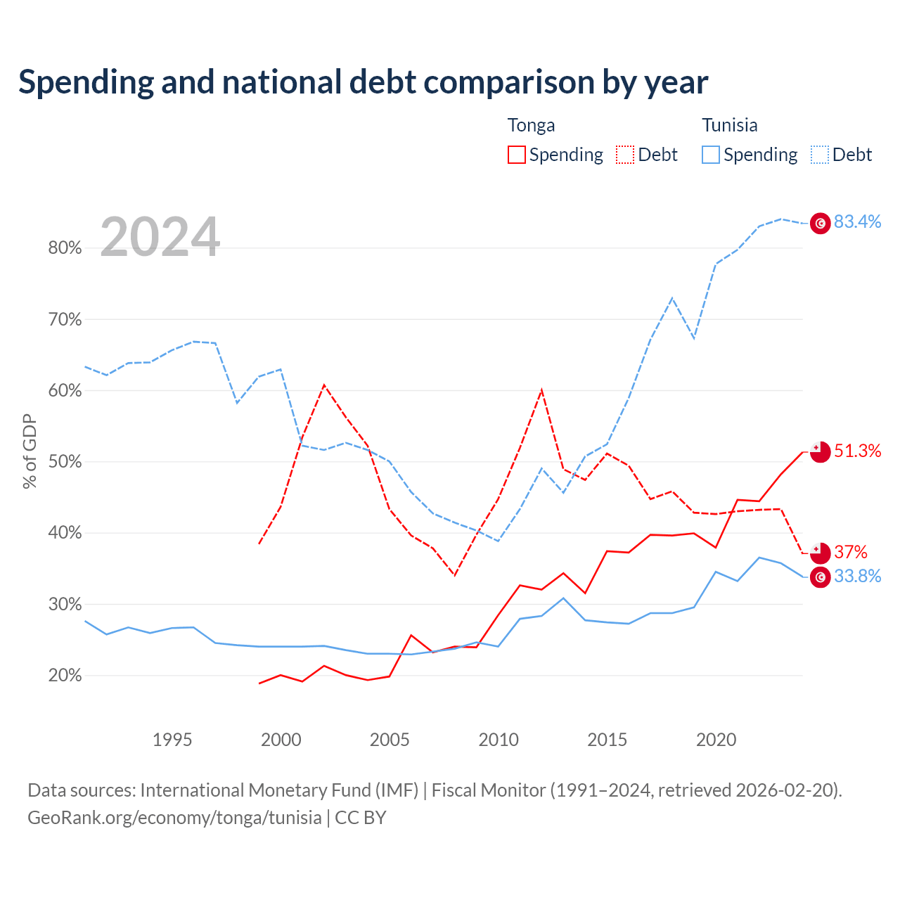 Tonga has $256M in government debt (37% of GDP), compared to $42.8B (83.4% of GDP) in Tunisia.