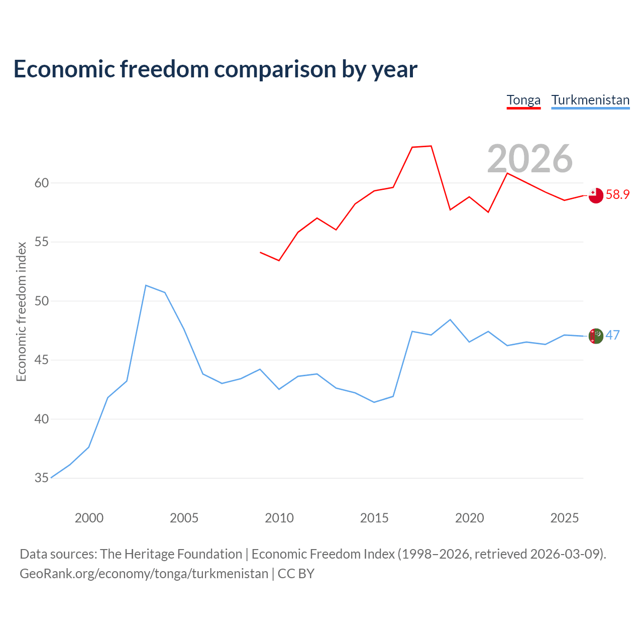 The Economic Freedom Index for Tonga is 58.9, ranking 107/197, compared to 47 for Turkmenistan, ranking 177/197. The chart above displays a comparison of annual changes in economic freedom indexes.