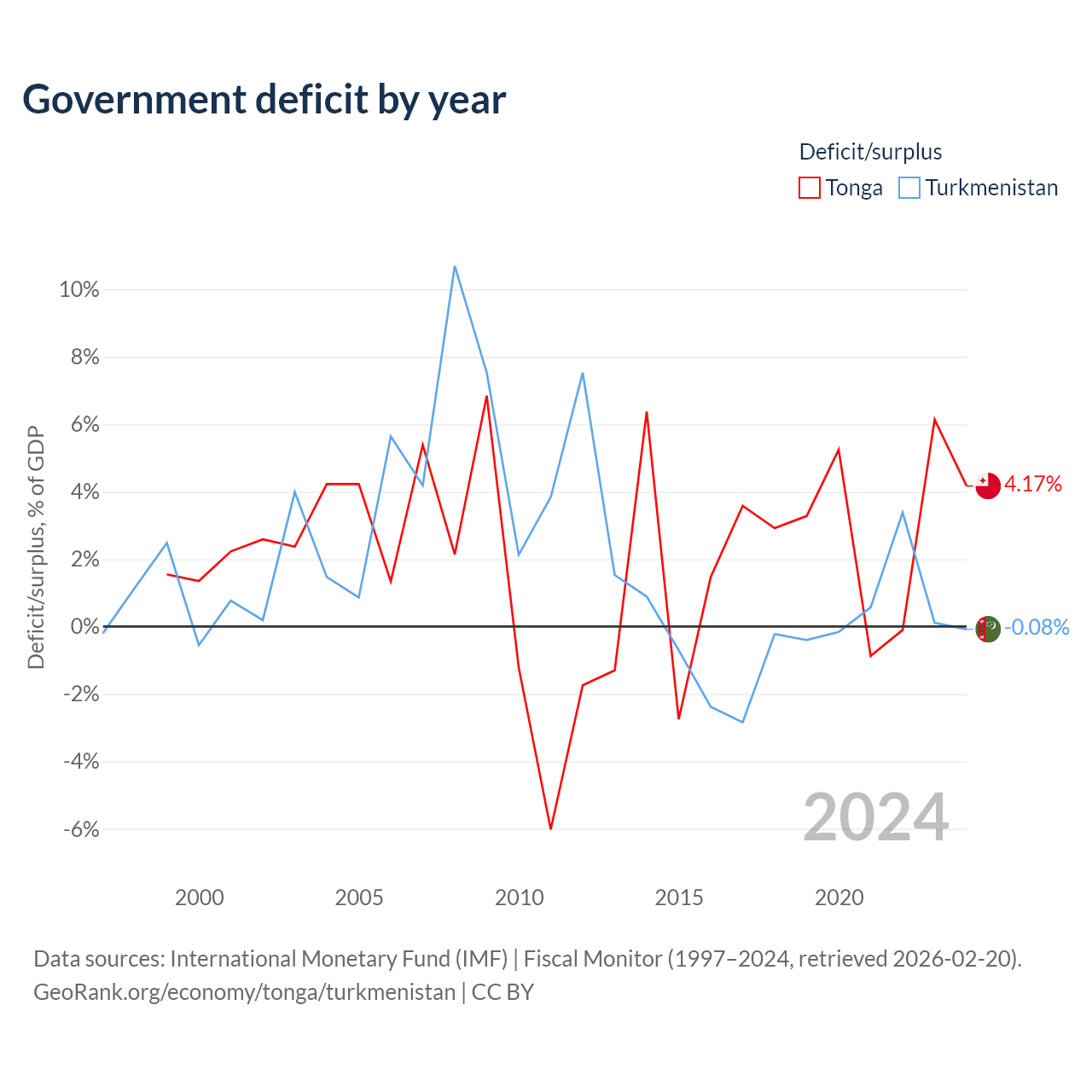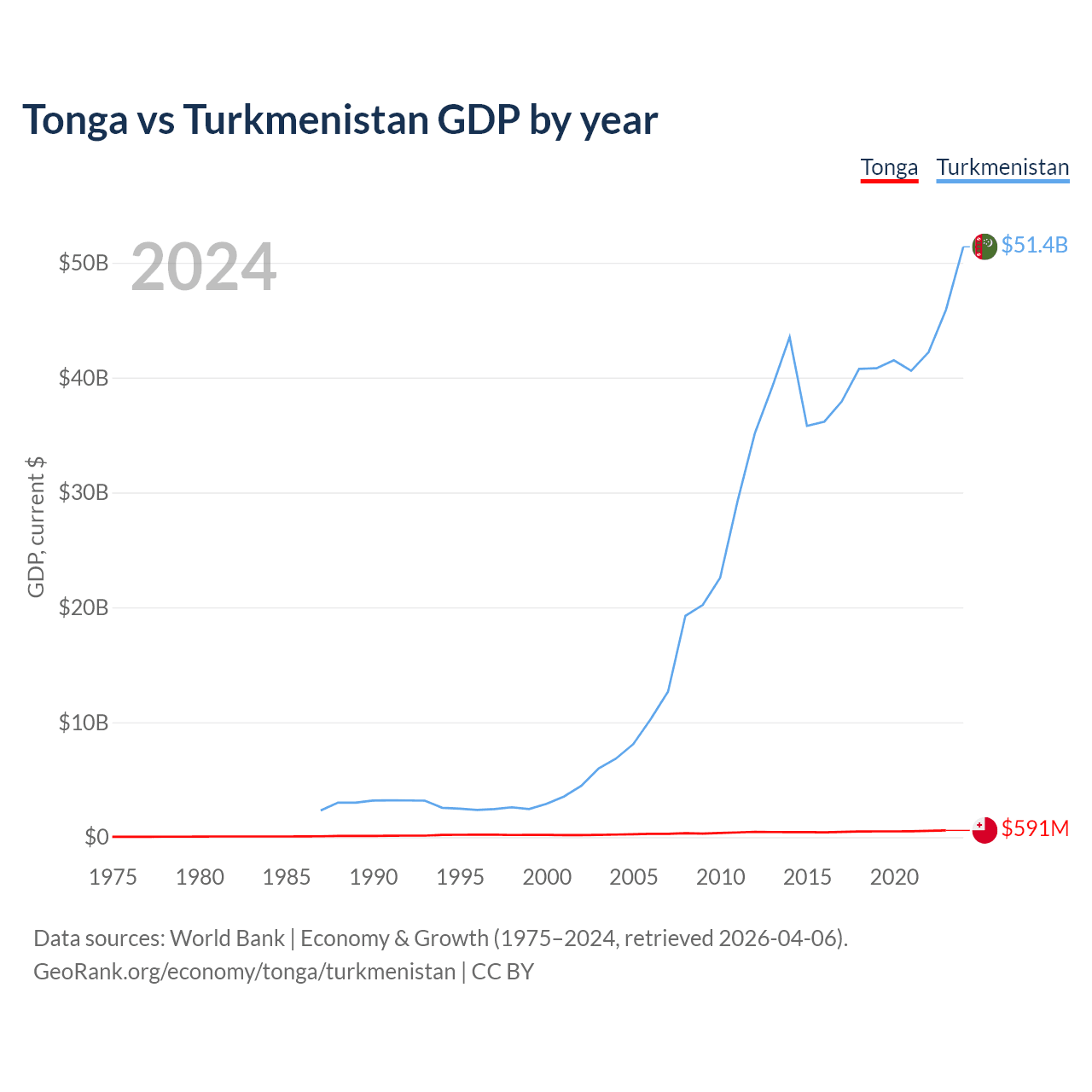 Tonga has a GDP of $591M compared to $51.4B for Turkmenistan, ranking 191/197 and 92/197 by economy size, respectively.