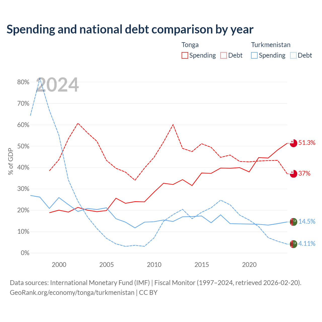 Tonga has $256M in government debt (37% of GDP), compared to $2.11B (4.11% of GDP) in Turkmenistan.