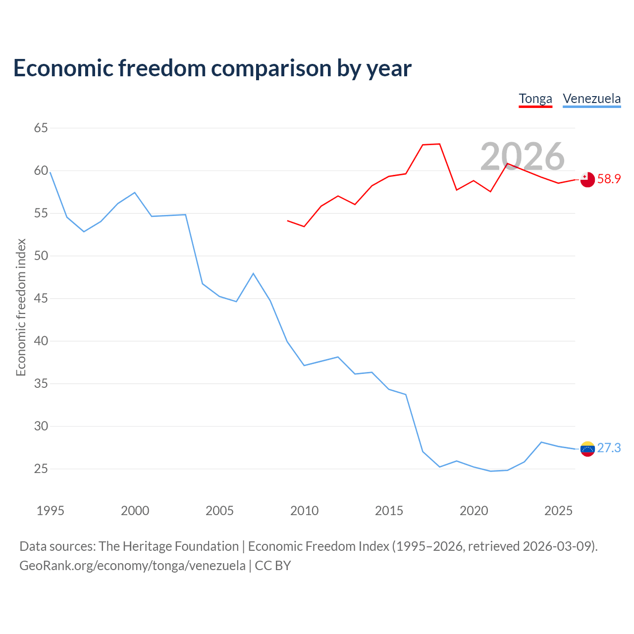 The Economic Freedom Index for Tonga is 58.9, ranking 107/197, compared to 27.3 for Venezuela, ranking 194/197. The chart above displays a comparison of annual changes in economic freedom indexes.