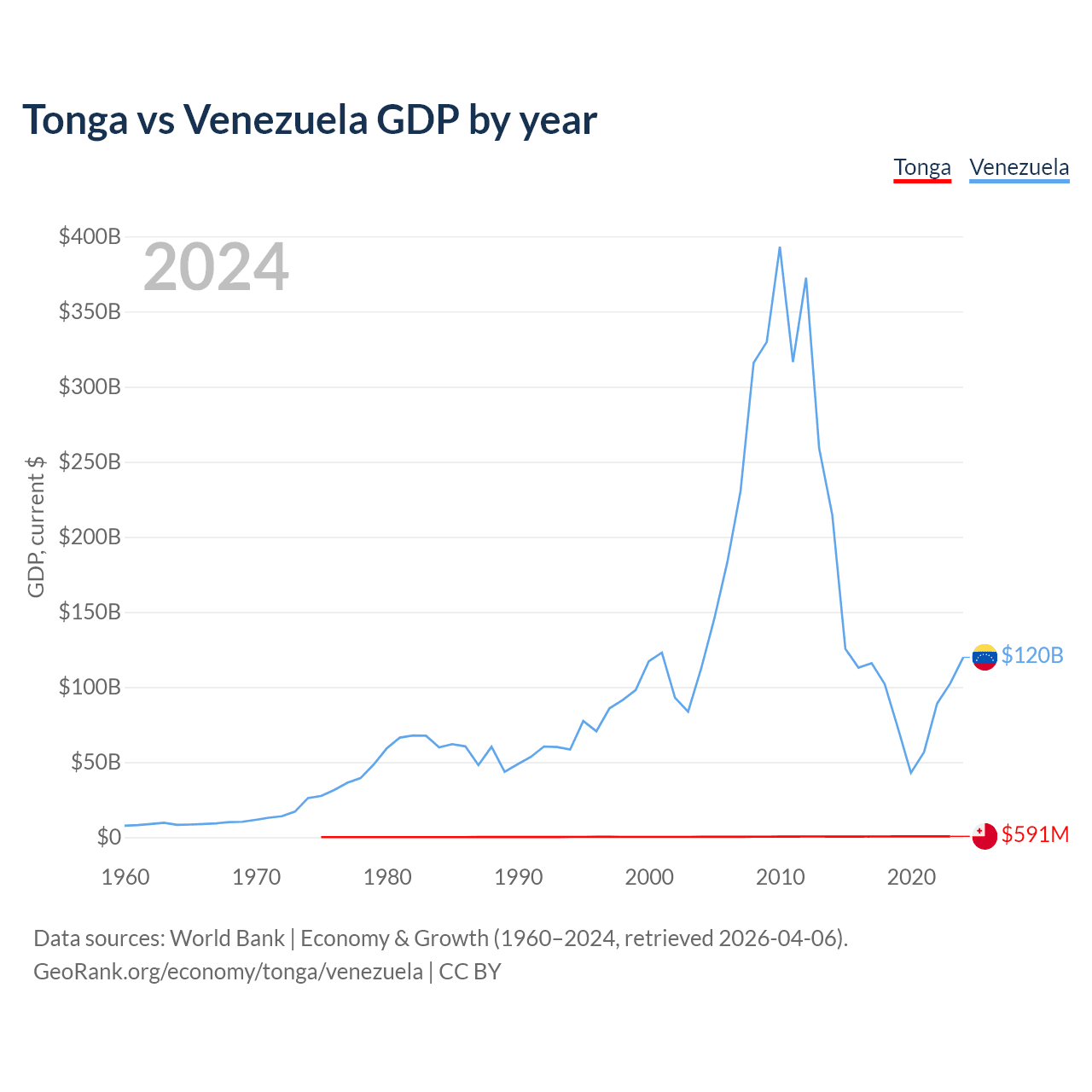 Tonga has a GDP of $591M compared to $120B for Venezuela, ranking 191/197 and 65/197 by economy size, respectively.