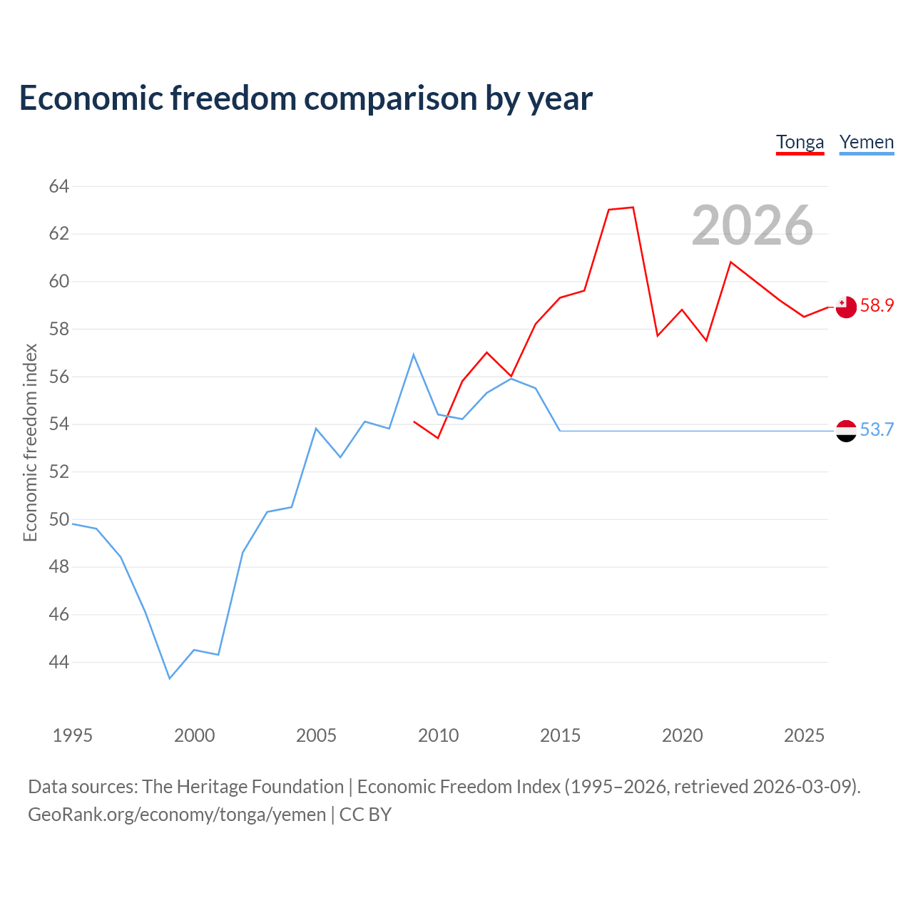 The Economic Freedom Index for Tonga is 58.9, ranking 107/197, compared to 53.7 for Yemen, ranking 138/197. The chart above displays a comparison of annual changes in economic freedom indexes.