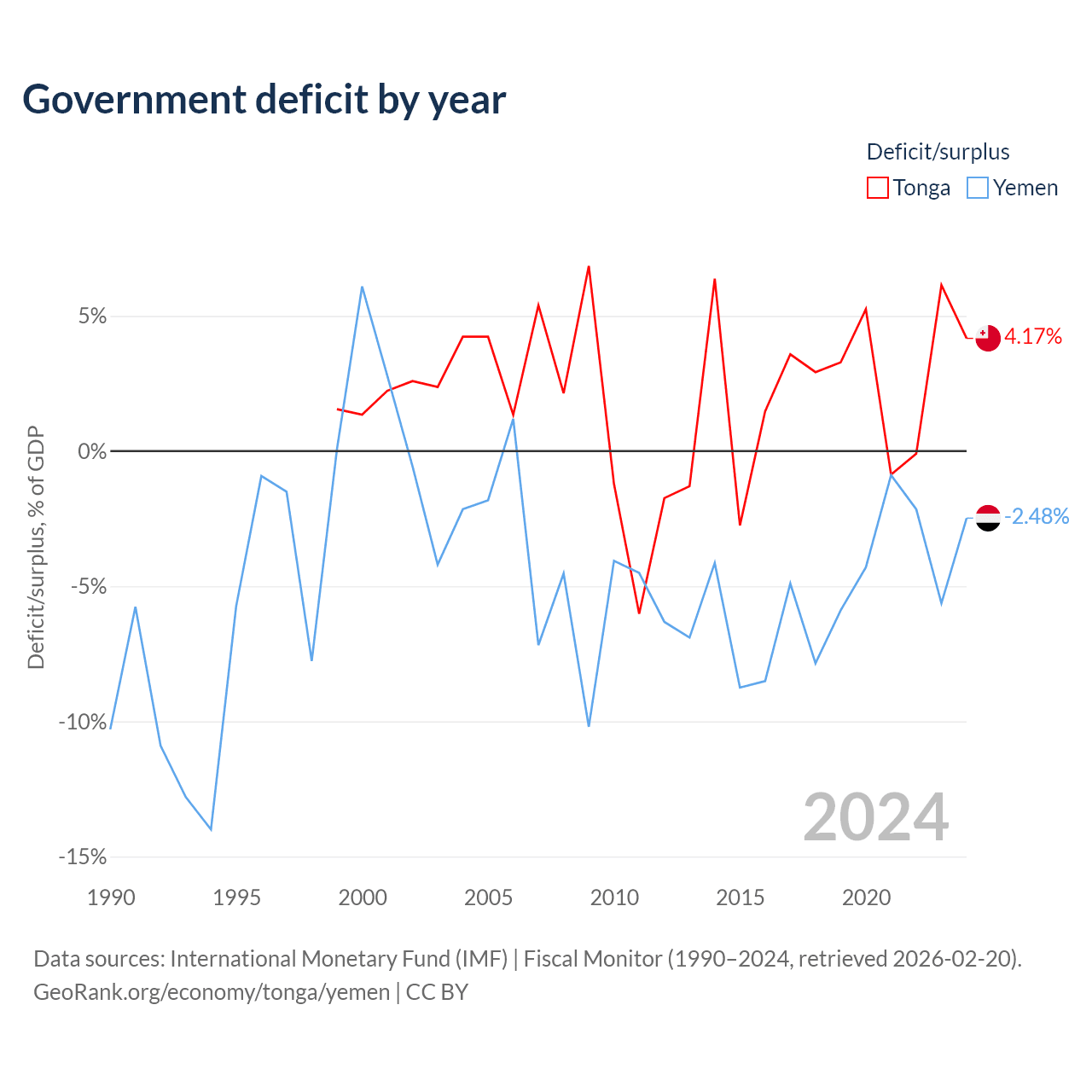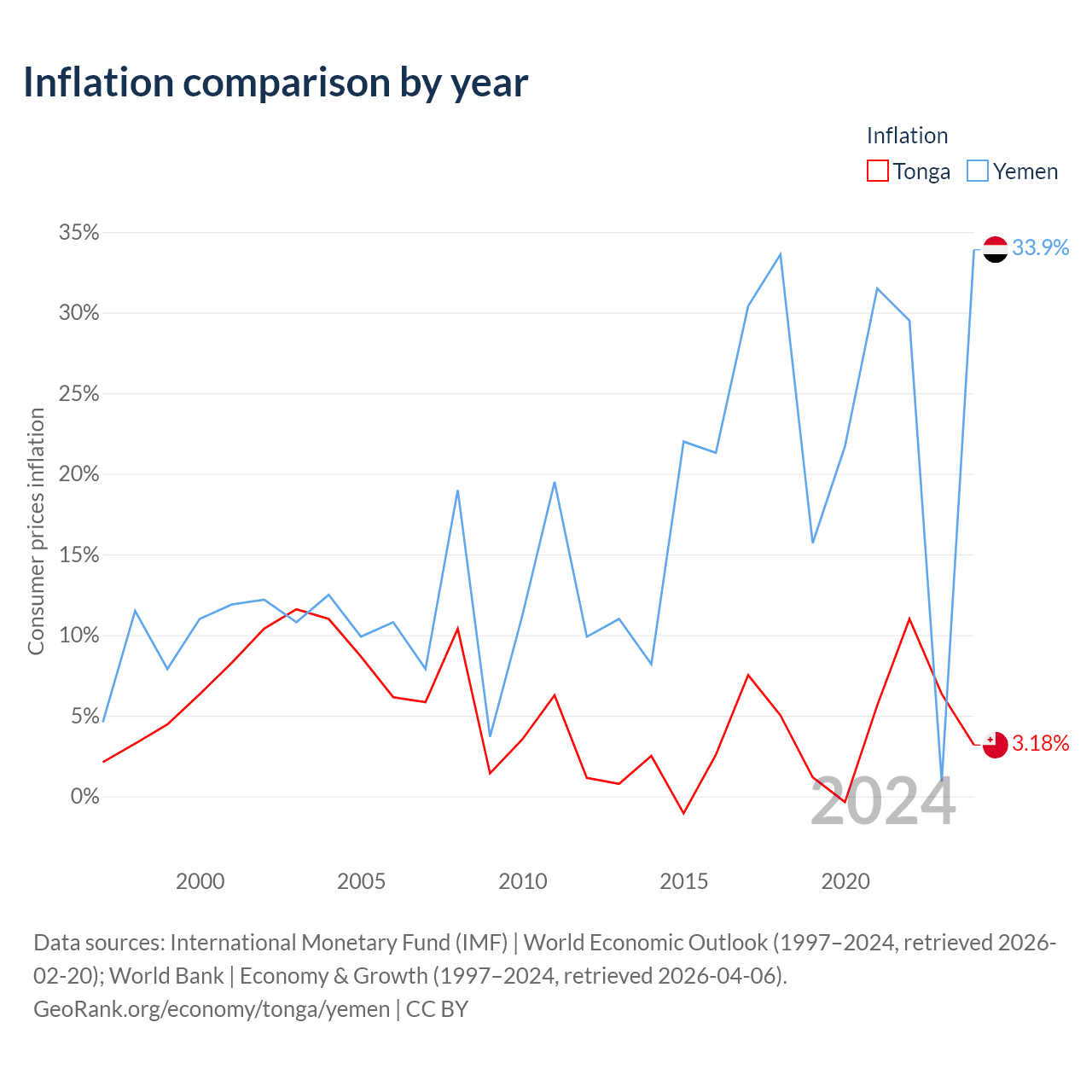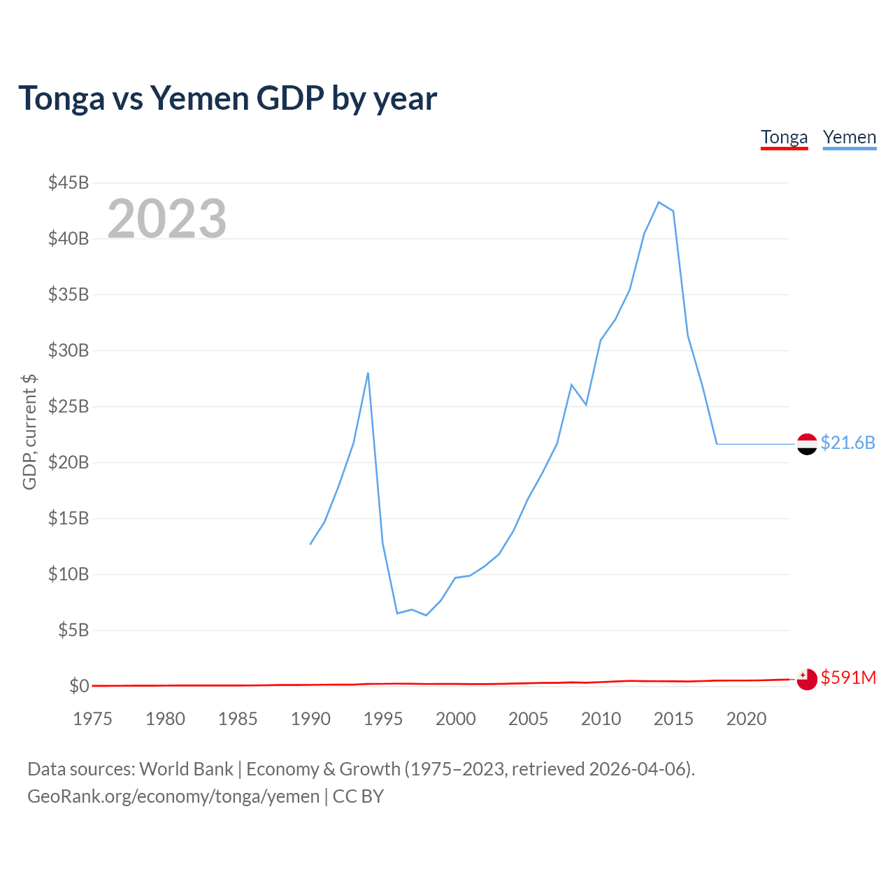 Tonga has a GDP of $591M compared to $21.6B for Yemen, ranking 191/197 and 125/197 by economy size, respectively.